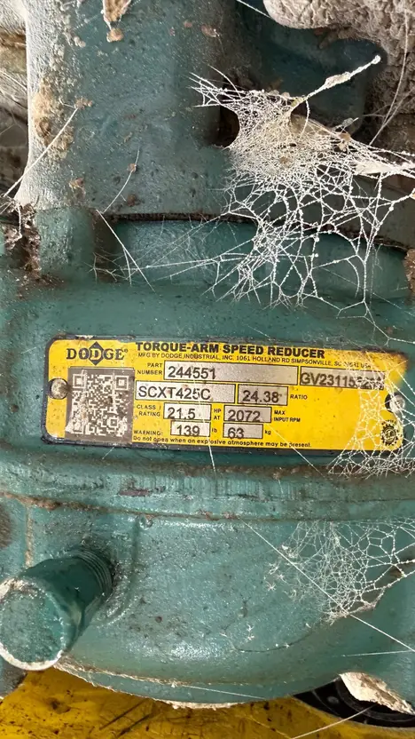 • GEARBOX: DODGE TORQUE-ARM SPEED REDUCER, MODEL SCXT425C, RATIO 24.38:1, CLASS 21.5, INPUT 2072 RPM