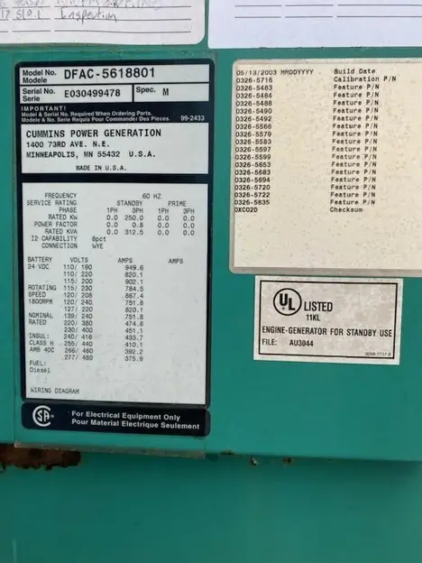 FULLY FUNCTIONAL, WELL-MAINTAINED CUMMINS DFAC-5618801 250 KW GENERATOR AVAILABLE AT OUR OTTER CREEK SUBSTATION.