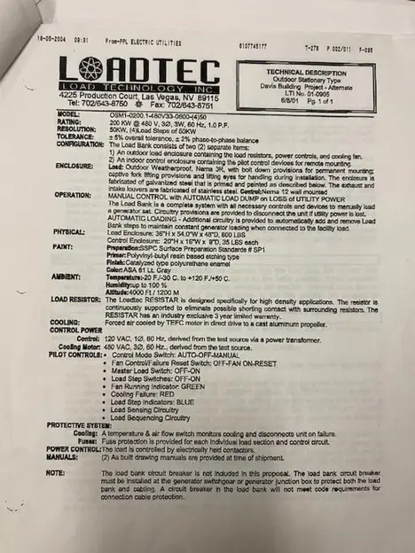 A LOAD BANK, MODEL OSM1-0200.1-480V33-0600-4)50, WITH A RATING OF 200 KW AND 480V, IS AVAILABLE FROM PPL ELECTRIC UTILITIES. IT FEATURES A CONFIGURATION WITH OUTDOOR AND INDOOR ENCLOSURES FOR LOAD RESISTORS, POWER CONTROLS, AND COOLING FAN. THE LOAD BANK IS DESIGNED FOR STATIONARY USE AND INCLUDES FEATURES LIKE AUTOMATIC LOADING, MANUAL CONTROL, AND LOAD SENSING CIRCUITRY. IT IS HOUSED IN AN OUTDOOR WEATHERPROOF ENCLOSURE WITH GALVANIZED STEEL CONSTRUCTION AND STAINLESS STEEL LOUVERS. THE LOAD BANK IS DESIGNED FOR HIGH-DENSITY APPLICATIONS AND IS CONTINUOUSLY SUPPORTED TO PREVENT SHORTING. IT IS POWERED BY A TEFC MOTOR.
