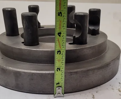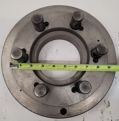 THE D1-8 LATHE CHUCK BACK PLATE IS A PRECISION-ENGINEERED COMPONENT DESIGNED FOR COMPATIBILITY WITH D1-8 SPINDLE NOSES, FACILITATING SECURE AND EFFICIENT LATHE CHUCK MOUNTING. THIS ADAPTER BACK PLATE FEATURES AN OVERALL DIAMETER OF 11 INCHES, PROVIDING A ROBUST AND STABLE INTERFACE FOR VARIOUS LATHE OPERATIONS. THE INNER RING MEASURES 9 INCHES IN DIAMETER, ENSURING A SNUG FIT WITH COMPATIBLE CHUCKS. THE HUB DIAMETER IS 5.5 INCHES, WITH A BACKSIDE HUB DIAMETER OF 4 INCHES, OFFERING A RELIABLE CONNECTION TO THE LATHE SPINDLE. THE BACK PLATE HAS A HEIGHT OF 3 INCHES, CONTRIBUTING TO ITS STRUCTURAL INTEGRITY AND DURABILITY. IT INCLUDES A PIN DIAMETER OF 1 INCH, WHICH IS ESSENTIAL FOR PRECISE ALIGNMENT AND SECURE ATTACHMENT TO THE LATHE SPINDLE. THIS BACK PLATE IS AN IDEAL COMPONENT FOR ENHANCING THE VERSATILITY AND FUNCTIONALITY OF LATHE TOOLING SETUPS.