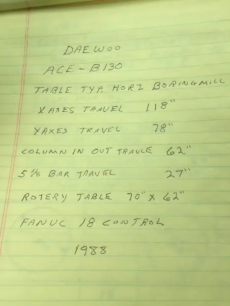 Dae Woo ACE-B130 Horizontal Boring Mill, X-118", Y-78", Spindle Travel-27", Column In and Out travel-62", 70" x 62" rotary table, Fanuc 18 CNC control, Spindle Dia.-5 1/8"