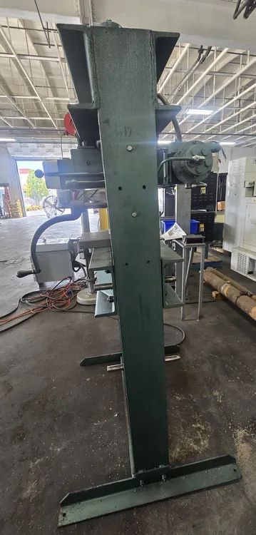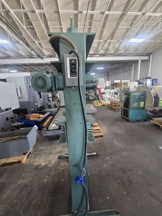THIS DAKE 5-050 ELEC-DRAULIC H FRAME PRESS IS AN ELECTRIC-HYDRAULIC, SINGLE-ACTING PRESS WITH A 50-TON CAPACITY AND A 2 HORSEPOWER MOTOR, OPERATING ON 220V/440V, 3-PHASE POWER AT 1,800 RPM. IT FEATURES A RAM ADVANCE SPEED OF 40 IPM AND A PRESSING SPEED OF 7 IPM, WITH A RAM TRAVEL OF 10 INCHES. THE WORKING RANGE PROVIDES A MINIMUM RAM-TO-TABLE DISTANCE OF 5 INCHES UP TO A MAXIMUM OF 40 INCHES. THE MACHINE IS CONSTRUCTED WITH A WIDTH BETWEEN UPRIGHTS OF 32-3/4 INCHES AND A WIDTH BETWEEN TABLE CHANNELS OF 7-1/4 INCHES. THE MOVABLE WORK-HEAD HAS A HORIZONTAL TRAVEL OF 14-3/8 INCHES AND IS ROLLER MOUNTED ON BALL BEARINGS FOR OFF-CENTER WORK. THE PRESS'S FOOTPRINT IS 43-1/2 INCHES BY 36 INCHES, WITH A HEIGHT OF 87 INCHES AND AN OPERATIONAL WEIGHT OF 1,320 LBS. OPERATIONAL FEATURES INCLUDE VARIABLE RAM SPEED FOR PRECISE PRESSURE CONTROL, RAPID RAM RETURN, A STROKE INDICATOR FOR ACCURATE RAM CONTROL, AND A SAFETY RELIEF VALVE FOR OVERLOAD PROTECTION. THE ADJUSTABLE TABLE IS MANAGED BY A SELF-LOCKING HOIST. STANDARD EQUIPMENT INCLUDES THE FRAME, TWO FORGED STEEL V-BLOCKS, A FLAT RAM NOSE, A PRESSURE GAUGE, A SELF-LOCKING TABLE HOIST, A WORKHEAD, TWO STEEL TABLE PLATES, A V-RAM NOSE, A STROKE INDICATOR, AND A SAFETY RELIEF VALVE.