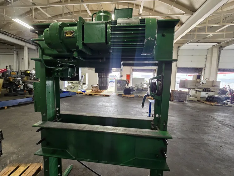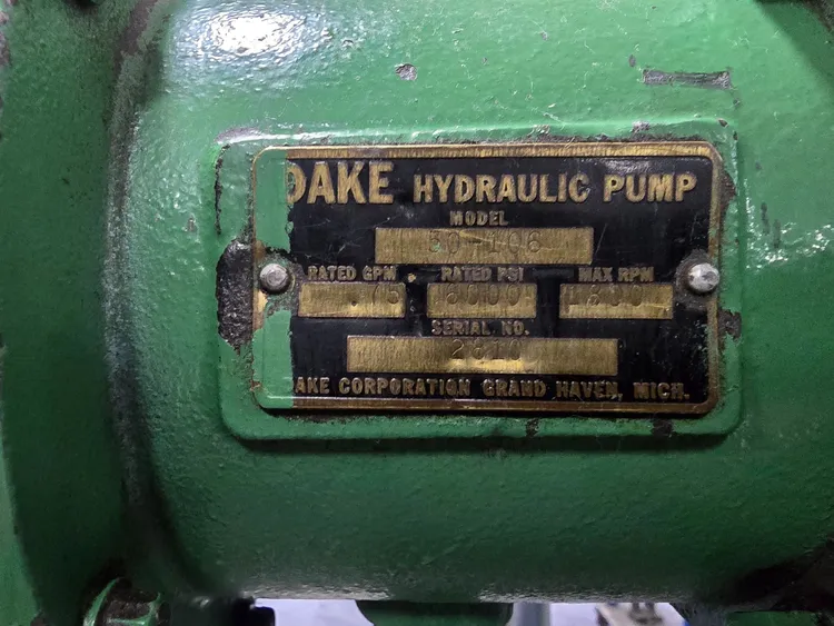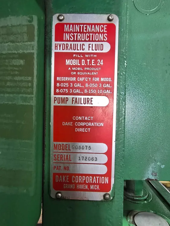 THE DAKE MODEL 908075, AN ELECTRIC-HYDRAULIC H-FRAME PRESS, OFFERS A DUAL-ACTING CAPACITY OF 75 TONS FOR PRESSING AND 28 TONS FOR PULLING. IT IS POWERED BY A 2 HP MOTOR, RATED FOR 220V OR 440V, 3-PHASE OPERATION, AND IS CURRENTLY WIRED FOR 440V. THE FRAME FEATURES A 44-INCH WIDTH BETWEEN UPRIGHTS AND AN 8 1/4-INCH WIDTH BETWEEN TABLE CHANNELS. THE RAM MECHANISM PROVIDES A 10-INCH STROKE, A MAXIMUM DAYLIGHT OPENING OF 33 INCHES, AND A RAM TRAVEL SPEED OF 5 INCHES PER MINUTE (IPM). THE OVERALL DIMENSIONS OF THE PRESS ARE APPROXIMATELY 55.5 INCHES LONG BY 36 INCHES WIDE BY 86 INCHES HIGH, WITH AN APPROXIMATE MACHINE WEIGHT OF 1,950 LBS.
