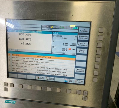 THE MAIN DRIVE MOTOR DELIVERS 44.2 HP, SUPPORTING A SPINDLE SPEED RANGE OF 20 TO 2500 RPM. BAR CAPACITY IS A MAXIMUM OF 4.75" WITH A SPINDLE HOLE DIAMETER OF 5.3". THE Y-AXIS STROKE IS 2.55". RAPID TRAVERSE RATES ARE 1771 IPM FOR X AND Z AXES, AND 32.8 IPM FOR THE Y-AXIS. THE MACHINE INCLUDES A BMF HEAVY-DUTY CHIP CONVEYOR, A CHIPBLASTER HIGH-PRESSURE COOLANT FILTRATION SYSTEM WITH A MISTBLASTER MIST COLLECTOR, AND A PEDIA COOLANT FILTRATION SYSTEM. APPROXIMATE DIMENSIONS WITH THE CHIP CONVEYOR ARE 205" L X 83" W X 90" H, WITH A WEIGHT OF APPROXIMATELY 22,000 LBS.