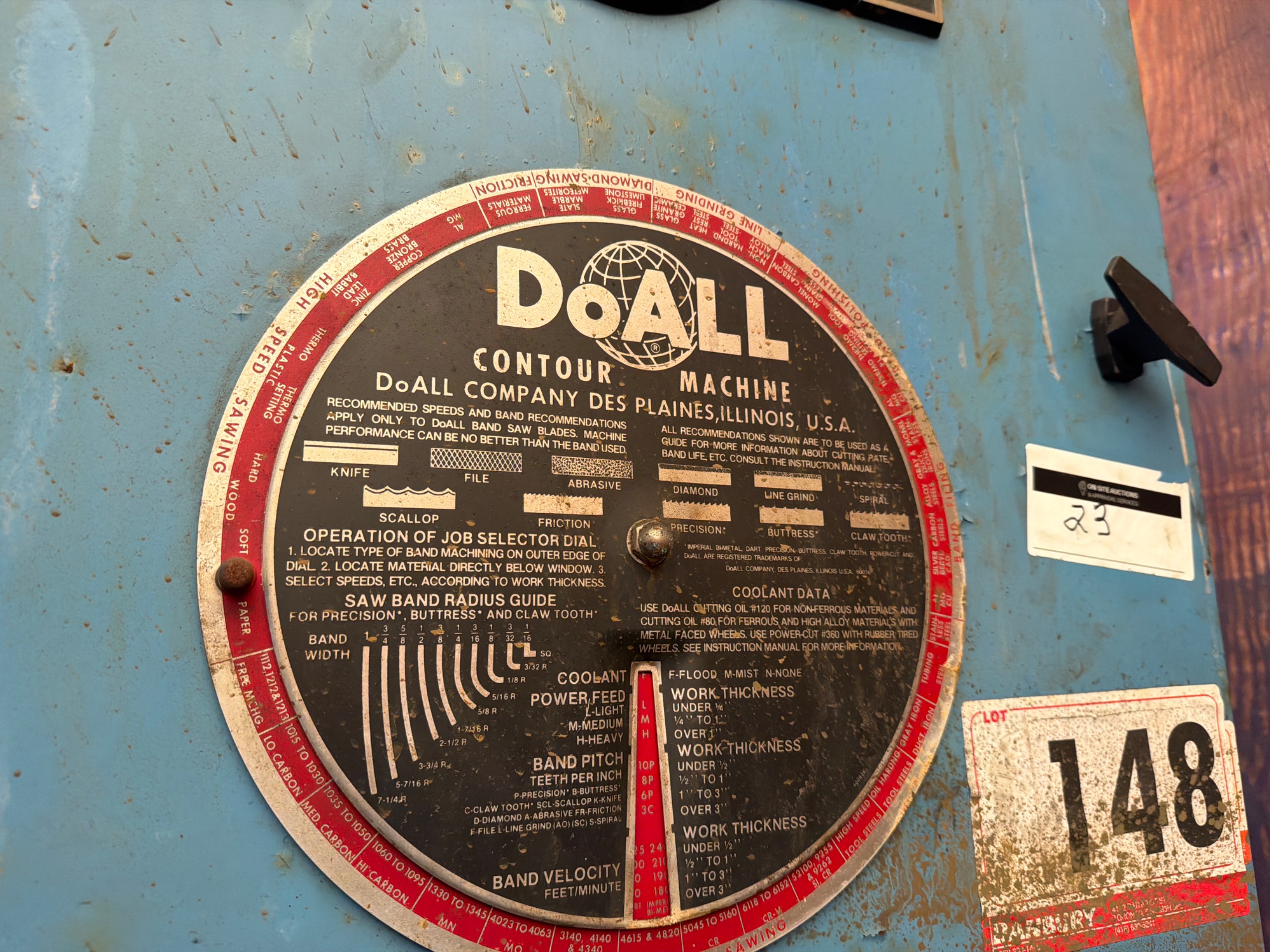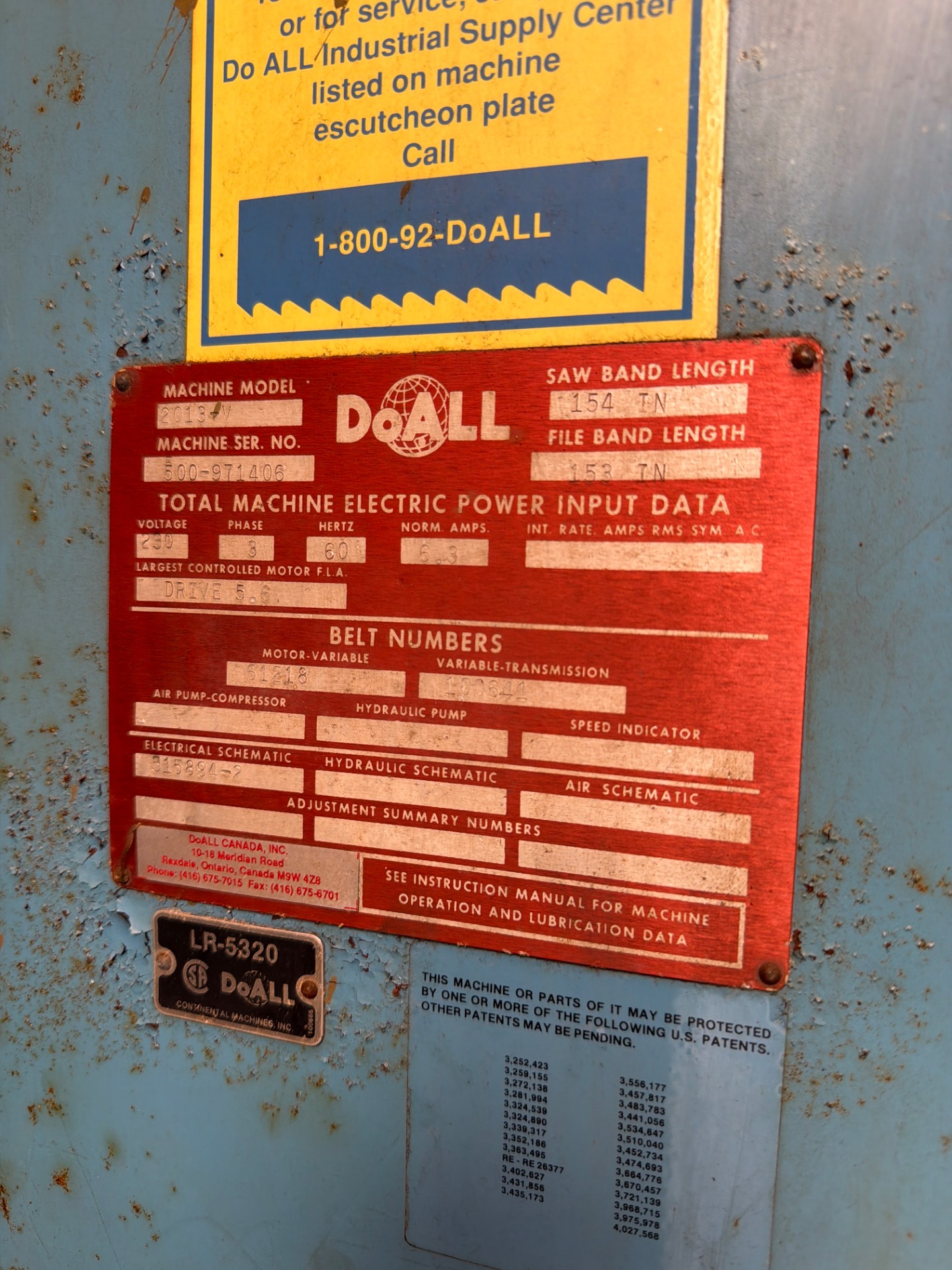 THE DOALL 2013-V IS A VERTICAL CONTOUR METAL-CUTTING BAND SAW DESIGNED FOR VERSATILITY IN TOOL ROOMS AND MAINTENANCE SHOPS. IT FEATURES A 20-INCH THROAT CAPACITY AND A MAXIMUM WORK HEIGHT OF 13 INCHES. THE MACHINE IS EQUIPPED WITH A 2 HP MOTOR AND A DUAL-RANGE TRANSMISSION PROVIDING VARIABLE BAND SPEEDS RANGING FROM 50 TO 5,200 FPM. ITS WORK TABLE MEASURES 26 BY 26 INCHES AND OFFERS TILTING CAPABILITIES OF 45 DEGREES TO THE RIGHT AND 10 DEGREES TO THE LEFT TO ACCOMMODATE VARIOUS CUTTING ANGLES. THE SAW UTILIZES A BAND LENGTH OF 154 INCHES AND CAN ACCEPT BAND WIDTHS UP TO 1 INCH.