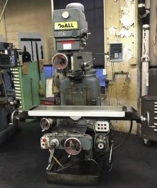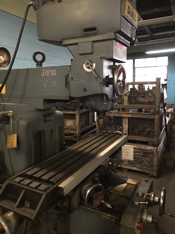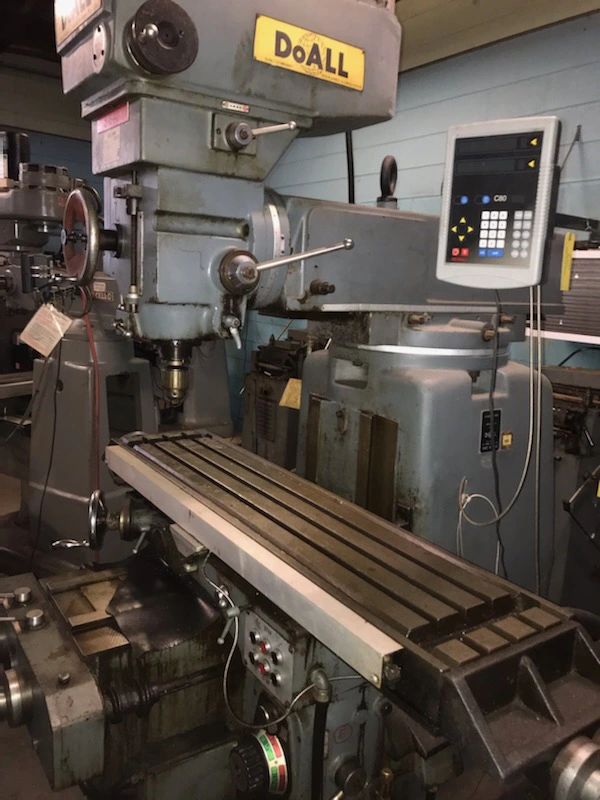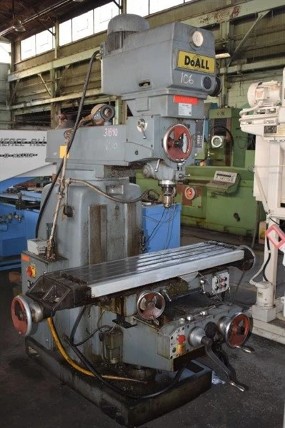 THE DOALL FV-4V VERTICAL MILL IS A HEAVY-DUTY MACHINE FEATURING A SUBSTANTIAL 12″ X 52.75″ TABLE WORKING SURFACE AND AN APPROXIMATE WEIGHT OF 4900 LBS. THE MACHINE OFFERS SIGNIFICANT TRAVEL CAPACITY, INCLUDING 31.5″ LONGITUDINAL (X-AXIS) TRAVEL, 15.75″ SADDLE CROSS (Y-AXIS) TRAVEL, AND 17.62″ KNEE VERTICAL (Z-AXIS) TRAVEL. THE QUILL PROVIDES 6″ OF TRAVEL AND HAS A 3.375″ DIAMETER. POWERED BY A 4 HP SPINDLE HEAD MOTOR, THE SPINDLE FEATURES AN NS40 TAPER AND OFFERS INFINITELY VARIABLE SPEEDS RANGING FROM 60 TO 4150 RPM. THE SPINDLE-HEAD CAN ACHIEVE 180-DEGREES LONGITUDINAL SWIVEL. FEED CAPABILITIES INCLUDE QUILL FEEDS FROM .003 TO .006 IPR, LONGITUDINAL AND CROSS FEEDS FROM 1/2 TO 20.875 IPM, AND VERTICAL KNEE FEEDS FROM 1/4 TO 10.5 IPM. IT IS EQUIPPED WITH C80 NEWALL DIGITAL READOUTS AND POWER FEED TO THE TABLE, QUILL, SADDLE, AND KNEE. THE MAXIMUM WORKPIECE LOAD CAPACITY IS 1500 LBS.