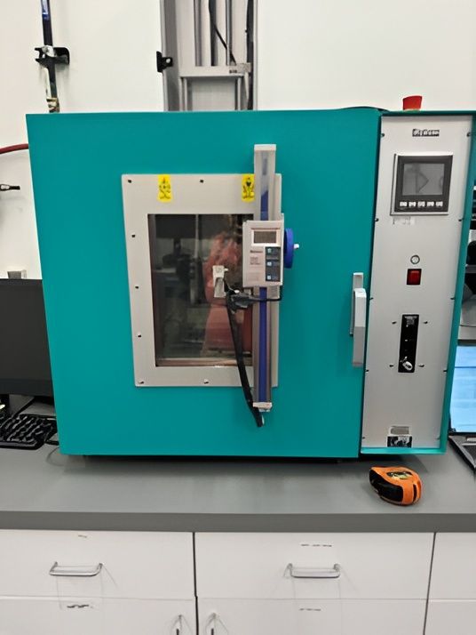 THE ELASTOCON EB 16-II HOT SET TESTER IS DESIGNED FOR HOT SET TESTING OF CABLE INSULATION AND SHEATHING MATERIALS ACCORDING TO IEC 60811-2-1, IEC 60811-507, AND EQUIVALENT STANDARDS. BUILT ON A HIGH-PRECISION AGEING OVEN, THE UNIT FEATURES A STAINLESS STEEL INNER CHAMBER WITH A 60-LITER USEFUL VOLUME AND A TEMPERATURE RANGE OF +40 °C TO +250 °C. TEMPERATURE CONTROL IS MAINTAINED VIA A PT 100 SENSOR AND MICRO PLC WITH A COLOR TOUCH SCREEN, OFFERING A SETPOINT RESOLUTION OF 0.1 °C AND VARIATIONS IN TIME AND SPACE OF ± 0.25 °C AND ± 0.5%, RESPECTIVELY. TO MINIMIZE HEAT LOSS, SAMPLES ARE INTRODUCED THROUGH A SMALL OPENING IN THE TOP. A SERVO MOTOR-DRIVEN SCREW SYSTEM MOVES THE SAMPLE HOLDER TO MAINTAIN A STABLE WORKING HEIGHT. THE OVEN UTILIZES A CONTROLLED AIR EXCHANGE RATE (3–200 CHANGES/HOUR) AND LOW AIR SPEED (<0.001 M/S) MONITORED BY A FLOW METER. MEASUREMENTS ARE PERFORMED THROUGH A FOUR-PANE GLASS WINDOW USING A DOOR-MOUNTED LASER POINTER FOR ELONGATION AND A DIGITAL CALIPER FOR TENSION SET. DATA IS TRANSMITTED VIA BLUETOOTH OR WIRELESS CONNECTION TO A COMPUTER FOR AUTOMATED REPORTING IN SPREADSHEET TEMPLATES. SAFETY FEATURES INCLUDE ADJUSTABLE OVER/UNDER TEMPERATURE ALARMS, A FIXED OVER-TEMPERATURE FUSE AT 340 °C, AND COOLING CHANNELS IN THE POWDER-COATED STEEL CASING TO MAINTAIN LOW SURFACE TEMPERATURES. THE SYSTEM OPERATES ON 220–240 V, 50 HZ POWER WITH A 2,200 W RATING AND WEIGHS APPROXIMATELY 120 KG.
