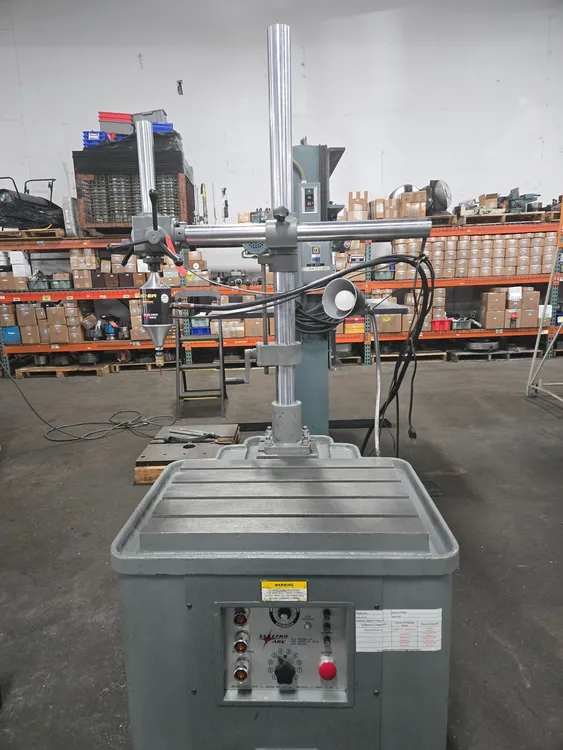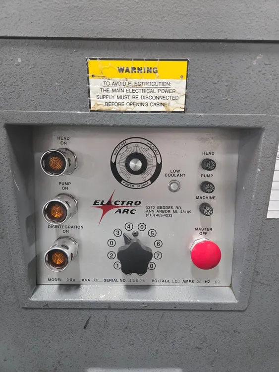 THE ELECTRO-ARC MODEL 25A TAP DISINTEGRATOR, DESIGNATED AS MODEL 2SA, IS RATED FOR 10 KVA AND OPERATES ON 220V SINGLE PHASE, 26AMPS, 60HZ POWER. IT IS EQUIPPED WITH AN ARCER HEAD AND FEATURES DUAL/HORIZONTAL CROSSARMS. THE MACHINE UTILIZES AN 18"X 26" T-SLOT TABLE WHICH IS A SOLID CAST, GROUND WORKTOP WITH T-SLOTS FOR ANCHORING AND TROUGHS FOR COOLANT RECYCLING. THE INTEGRATED BASE/CABINET SUPPORTS THE WORKTOP AND HOUSES THE POWER SUPPLY, CONTROL PANEL, AND THE BUILT-IN COOLANT SYSTEM, WHICH DELIVERS 90 PSI COOLANT PRESSURE VIA AN INTERNAL PUMP AND FILTER. THE SUPERSTRUCTURE FEATURES A STURDY, FIRMLY-MOUNTED COLUMN WITH A DIAMETER OF 2-3/4” (70 MM) AND A HEIGHT OF 50” (1270 MM). IT SUPPORTS THE OPERATING HEAD WITH DOUBLE CROSSARMS THAT MEASURE 36” (914 MM) LONG AND 1-1/2” (38 MM) IN DIAMETER, ENSURING RIGID SUPPORT ACROSS THE WORK SURFACE. THE UNIT INCLUDES HEAVY-DUTY CASTERS FOR MOBILITY AND LEVELERS FOR OPERATIONAL STABILITY.