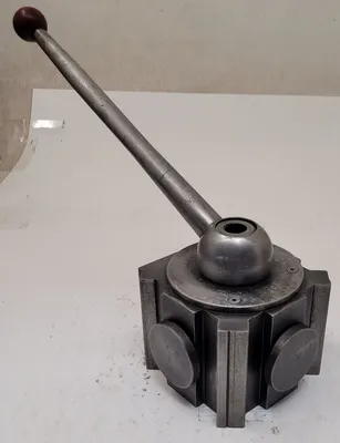 THIS IS AN ENCO MANUFACTURING QUICK CHANGE LATHE TOOL POST. IT IS DESIGNED TO ENHANCE PRECISION AND EFFICIENCY IN MACHINING TASKS. THE MEASURED DIMENSIONS OF THIS TOOL POST ARE 4.25 INCHES IN HEIGHT AND 5 SQUARE INCHES.