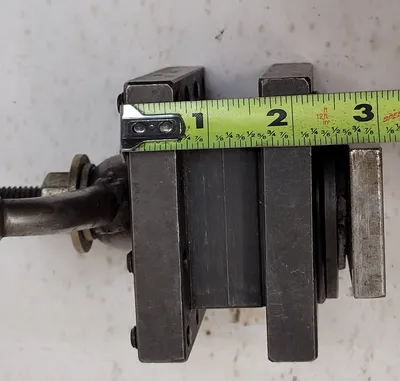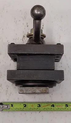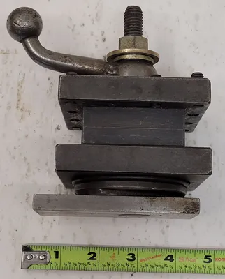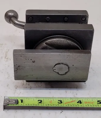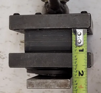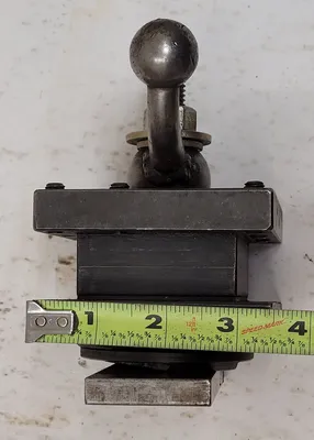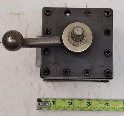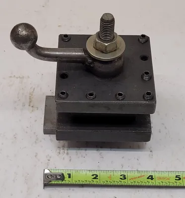 THIS IS AN ENCO MFG CO. SQUARE TOOL POST HOLDER. THE UNIT FEATURES DIMENSIONS OF 3.5 INCHES WIDE BY 3.5 INCHES LONG. THE HEIGHT MEASURES 2.25 INCHES WITHOUT THE BOTTOM PLATE AND 3-1/8 INCHES WITH THE BOTTOM PLATE INCLUDED. A 1-INCH GAP IS FEATURED ON THE TOOL POST HOLDER.