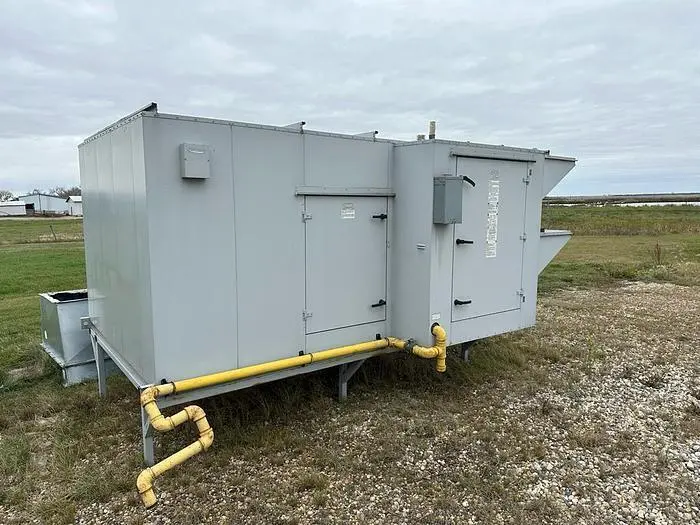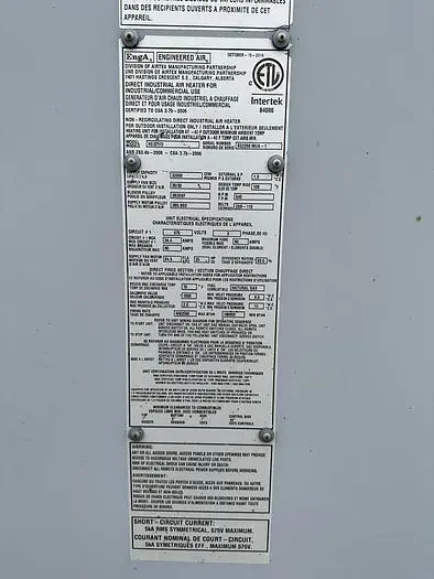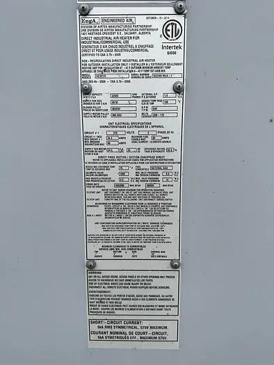 THIS IS AN ENGINEERED AIR HE321/O DIRECT FIRED HEATER DESIGNED FOR COMMERCIAL AND INDUSTRIAL APPLICATIONS. IT OPERATES ON NATURAL GAS AND PROVIDES AN AIR CAPACITY OF 32000 CFM, WHICH FALLS WITHIN THE HE SERIES RANGE OF 1,300 TO 100,000 CFM. THE UNIT UTILIZES A 575V ELECTRICAL CONNECTION AND FEATURES A 25 HP MOTOR. AS PART OF THE HE SERIES, IT INCLUDES HIGH-EFFICIENCY GREEN BURN BURNERS AND IS EQUIPPED WITH DEDICATED ENGA NEXTGEN DIGITAL CONTROLLERS. THE HE SERIES UNITS ARE AVAILABLE IN BOTH INDOOR AND OUTDOOR CONFIGURATIONS AND CAN HAVE HEATING CAPACITIES UP TO 14,000 MBH.