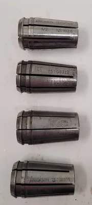THIS ERICKSON COLLET SET CONSISTS OF 15 INDIVIDUAL COLLETS DESIGNED FOR VARIOUS TOOLING AND ACCESSORY APPLICATIONS. THE SET INCLUDES A MIX OF TYPES AND SIZES, SPECIFICALLY: THREE 75TG0125 COLLETS, TWO 180DA0500 COLLETS, AND ONE EACH OF THE FOLLOWING: 180DA0406 13/32, 180DA0125, 180 7/16, 180 3/8, 75TG0188 3/16, 75TG0094 3/32, 75TG0500 1/2, 75TG0375 3/8, 75TG0312, AND 5/8. THE COLLETS ARE IDENTIFIED BY THE BRAND ERICKSON AND TOOL TYPE COLLETS.