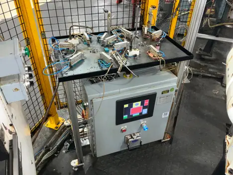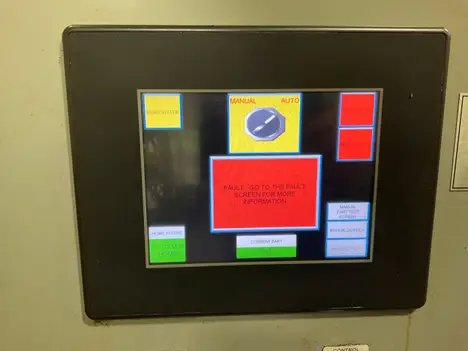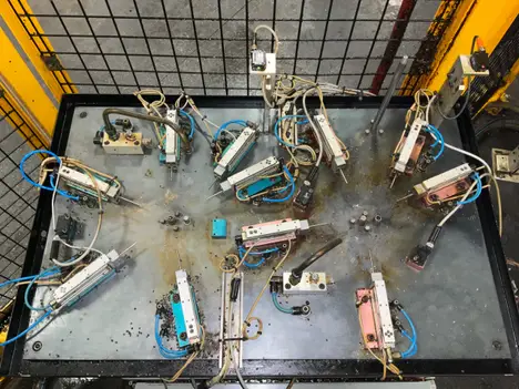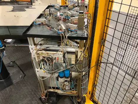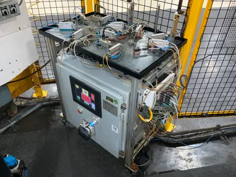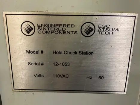 This machine is set up for 2 different parts and has air cylinders to go into holes to check for the presence of all the holes.