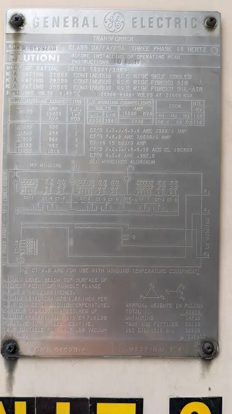 GENERAL ELECTRIC 35,00KVA POWER TRANSFORMER 20,900V-AC/6900Y-3985V-AC 3PH 60HZ 34,700LBS-CORE AND COILS 90,000LBS-TOTAL WEIGHT