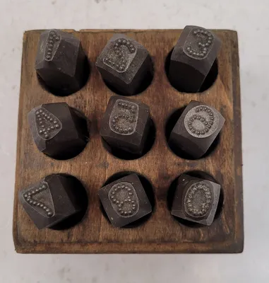 THIS IS A GEORGE SCHMIDT INC STAMP SET, SPECIFICALLY IDENTIFIED AS THE SCHMIDT NILES 0-8 # STAMP SET HI-LOY. THIS IS A 9-PIECE SET WITH A STAMP SIZE OF 3/8". THE SET INCLUDES A WOODEN BOX FOR STORAGE. THE MANUFACTURER IS GEORGE SCHMIDT INC.