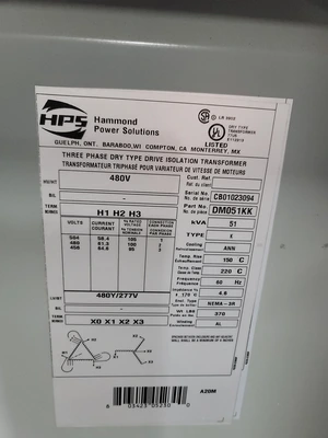 HAMMOND POWER SOLUTIONS DM051KK DRIVE ISOLATION TRANSFORMER, 51KVA, 480V PRI/480Y SEC