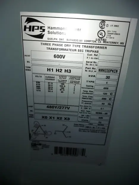 HAMMOND SOLUTIONS 600V-AC 480Y/277V 30 KVA DRY TYPE TRANSFORMER