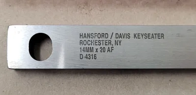 THE HANSFORD/DAVIS D-4316 IS A KEYSEATER DESIGNED FOR PRECISION CUTTING APPLICATIONS. THIS TOOLING ACCESSORY, IDENTIFIED BY PART NUMBER D-4316, FEATURES A WIDTH OF 14MM, A HEIGHT OF 1”, A PITCH OF 1/2", AND AN OVERALL LENGTH OF 20”.