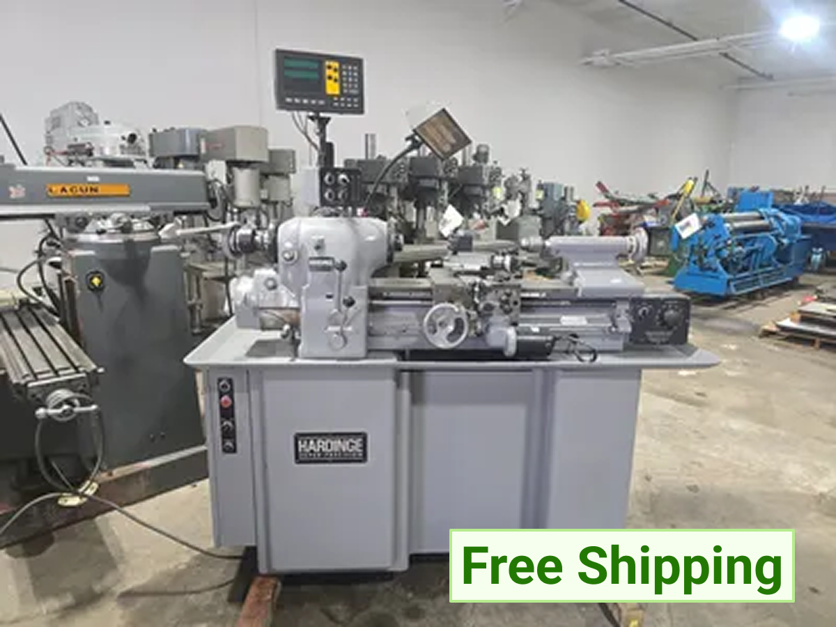 THIS IS A HARDINGE HLV-H WIDE BED TOOLROOM LATHE. IT FEATURES AN 11-INCH MAXIMUM SWING OVER THE BED, A 9-INCH MAXIMUM SWING OVER THE CARRIAGE, AND A 5.75-INCH MAXIMUM SWING OVER THE CROSS SLIDE. THE DISTANCE BETWEEN CENTERS IS 18 INCHES WITH THE TAILSTOCK FLUSH AND 20 INCHES WITH THE TAILSTOCK OVERHUNG. THE LATHE HAS A 1.25-INCH SPINDLE BORE AND A HARDINGE TAPERED SPINDLE NOSE. IT IS POWERED BY A 1.5 HP VARIABLE SPEED MOTOR, OFFERING VARIABLE SPINDLE SPEEDS FROM 125 TO 3000 RPM. THE MACHINE IS EQUIPPED WITH A 2-AXIS DRO, A 4-INCH 3-JAW CHUCK ON A 5C COLLET, AND A QUICK-CHANGE TOOLPOST. POWER FEED RANGES FROM 0.25 IPM TO 7 IPM, WITH A LONGITUDINAL FEED RATE OF 0.31 IPM TO 7 IPM AND A CROSS FEED RATE OF 0.18 IPM TO 4 IPM. THE COMPOUND SLIDE TRAVEL IS 3 INCHES, AND THE TAILSTOCK SPINDLE TRAVEL IS 3.75 INCHES WITH A NO. 2 MORSE TAPER. POWER REQUIREMENTS ARE 208 VOLTS / 60 HERTZ / 3 PHASE. THE DIMENSIONS ARE 6 FT. X 3 FT. X 5 FT.
