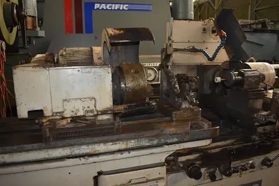CATALOG SPECIFICATIONS INCLUDE A MAXIMUM SWING OVER THE TABLE AND INSIDE THE COOLANT SPLASH GUARD OF 16". THE MACHINE CAN GRIND BORE DIAMETERS FROM A MINIMUM OF .125" UP TO A MAXIMUM OF 5.5", WITH A MAXIMUM BORE LENGTH OF 5". THE TABLE LONGITUDINAL TRAVEL IS 16", AND THE BRIDGE GRINDING ANGLE HAS A MAXIMUM INCLUDED ANGLE OF 30-DEGREES. THE WORKHEAD FEATURES A 1.625" HOLE THROUGH THE SPINDLE, A MAXIMUM SWIVEL ANGLE OF 60-DEGREES, AND FOUR SPEEDS RANGING FROM 133 TO 400 RPM, DRIVEN BY A 1.5 HP MOTOR. GRINDING TABLE SPEEDS ARE INFINITELY VARIABLE FROM 0 TO 20 FPM. CROSS FEED RANGES INCLUDE .0001" TO .001" FOR ROUGHING AND .0001" FOR FINISHING. THE OVERALL DIMENSIONS ARE 14'9" L X 5'6" W, WITH AN APPROXIMATE WEIGHT OF 13000 LBS.