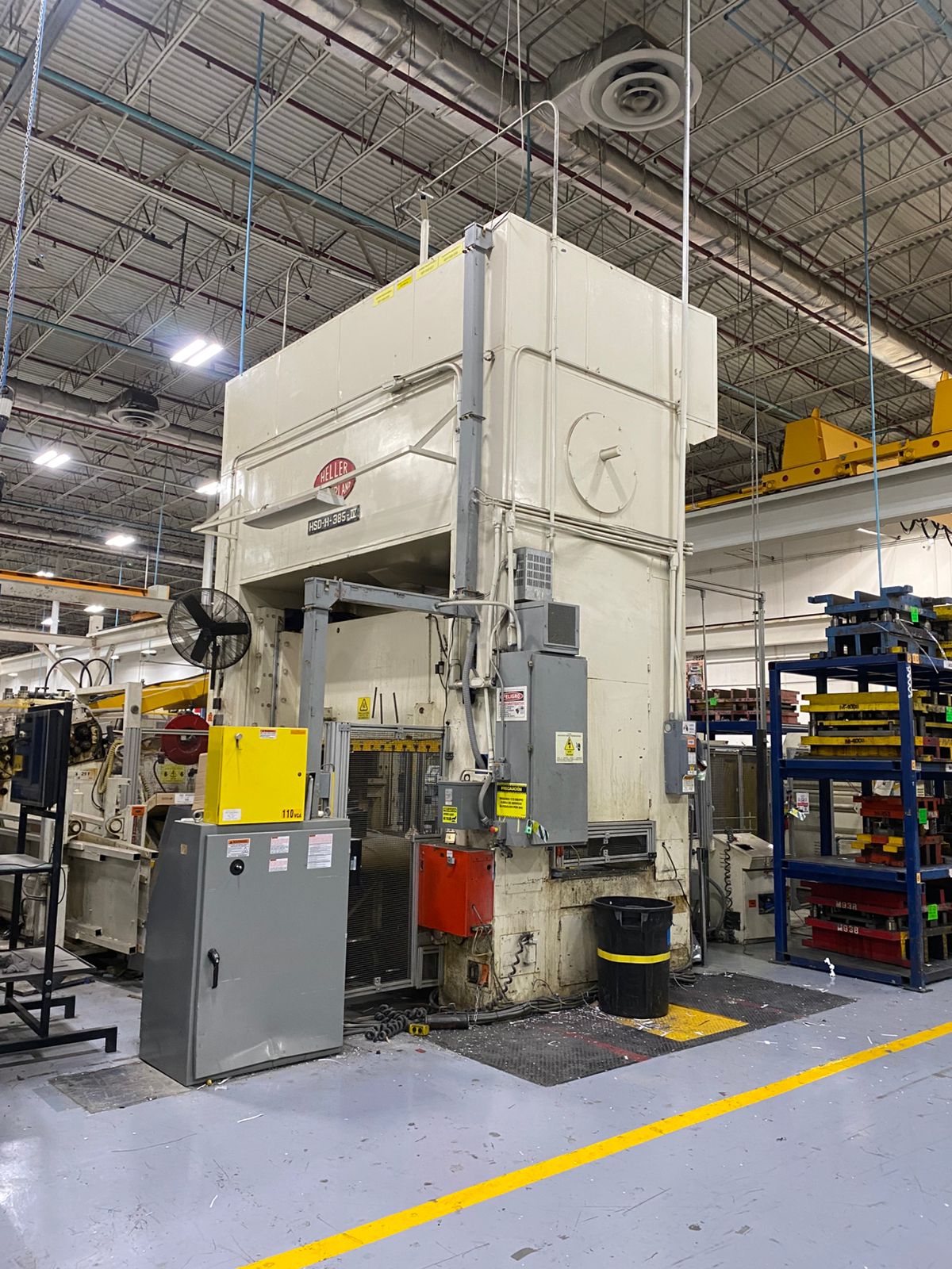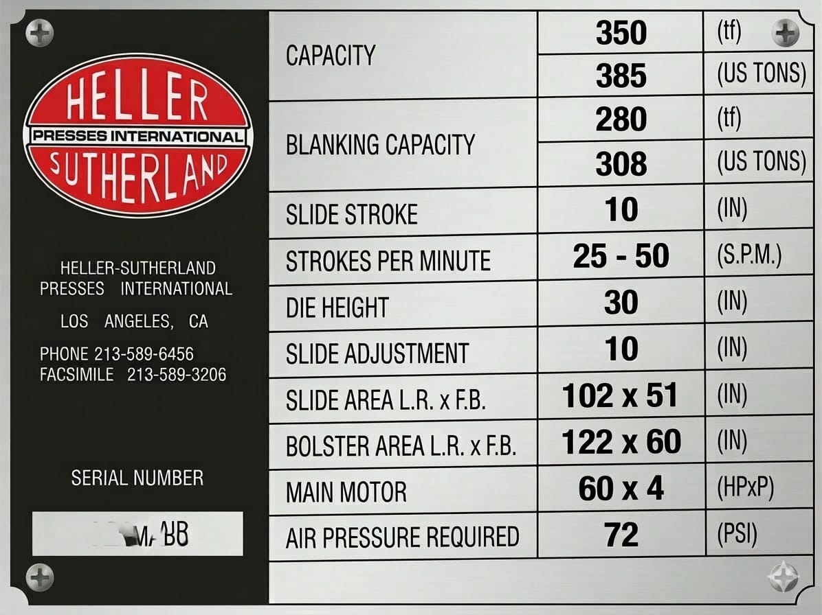 THIS HELLER-SUTHERLAND MODEL S016 IS A MECHANICAL PRESS WITH A CAPACITY OF 350 TF (385 US TONS) AND A BLANKING CAPACITY OF 280 TF (308 US TONS). THE MACHINE FEATURES A 10-INCH SLIDE STROKE AND A 10-INCH SLIDE ADJUSTMENT, WITH AN OPERATING SPEED RANGING FROM 25 TO 50 STROKES PER MINUTE. IT OFFERS A DIE HEIGHT OF 30 INCHES. THE SLIDE AREA MEASURES 102 X 51 INCHES (L.R. X F.B.), WHILE THE BOLSTER AREA PROVIDES 122 X 60 INCHES (L.R. X F.B.). POWER IS SUPPLIED BY A 60 X 4 HPXP MAIN MOTOR, AND THE SYSTEM REQUIRES 72 PSI OF AIR PRESSURE FOR OPERATION.