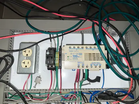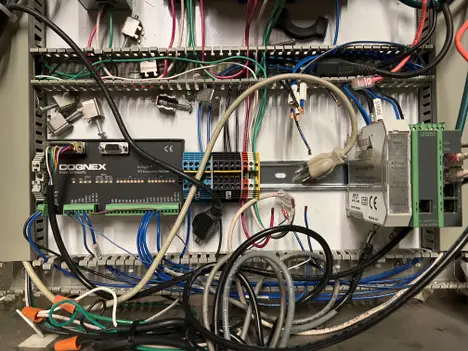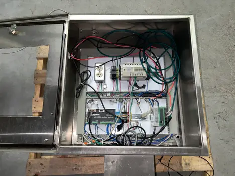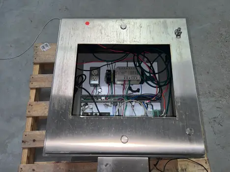 Hoffman WS242412SS junction box, hinged, with components. Includes Cognex In-Sight I/O expansion module and Idec 100W output power supply.