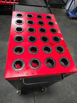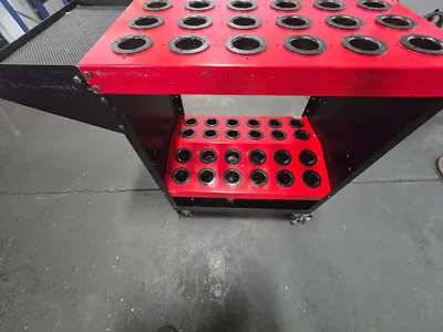 THE HUOT 48 TOOL, 40 TAPER TOOLSCOOT CNC TOOL CART IS CONSTRUCTED FROM STEEL, OFFERING A ROBUST LOAD CAPACITY OF 1,000 LBS. THIS CART IS DESIGNED TO HOLD 48 TOOLS AND ACCOMMODATES 40 TAPER TOOLING, SPECIFICALLY BT, CAT V FLANGE, AND NMTB HOLDERS. KEY DIMENSIONS INCLUDE A DEPTH OF 35-1/4 INCHES, A HEIGHT OF 35 INCHES, AND A WIDTH OF 18 INCHES. THE UNIT FEATURES 5.0000 INCH CASTERS ON MODELS EQUIPPED WITH WHEELS. INVENTORY INCLUDES THREE CARTS WITH WHEELS AND TWO CARTS WITHOUT WHEELS.
