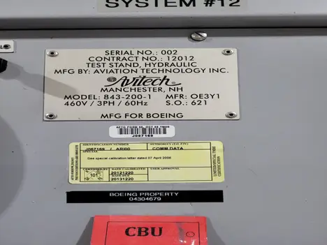 The Avitech AV843 Hydraulic Pump and Accessories Test Stand is designed to accurately perform overhaul and post-overhaul acceptance tests on hydraulic and pneumatic components such as valves, actuating cylinders, solenoid valves, reservoirs, accumulators, pumps, and other components. Unit has not been tested. All items sold as is, where is. For more information, contact Julie at 850-217-3768 or julie.f.hollenbaugh@boeing.com or Candace at 850-217-3251 or candace.r.ganhann@boeing.com