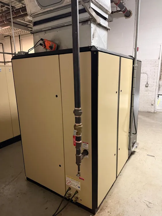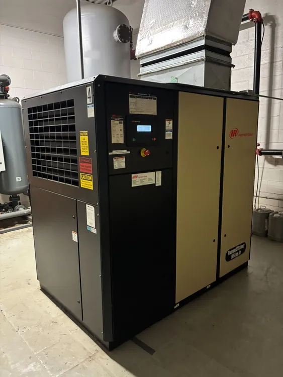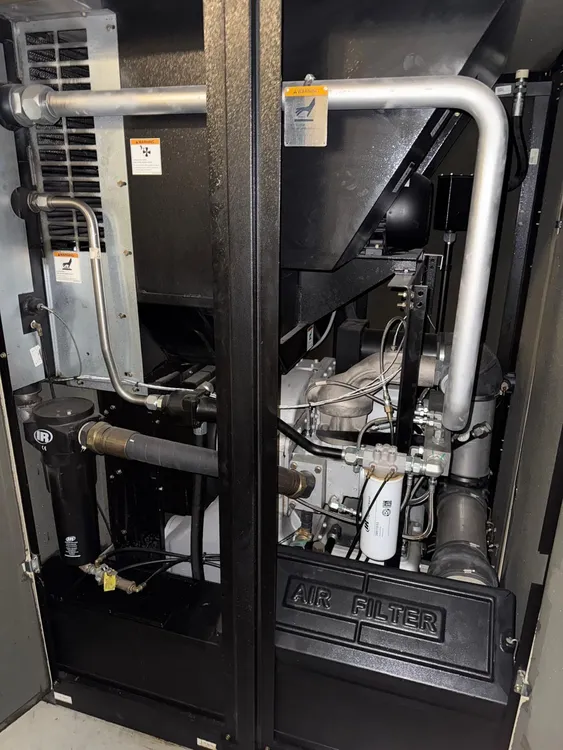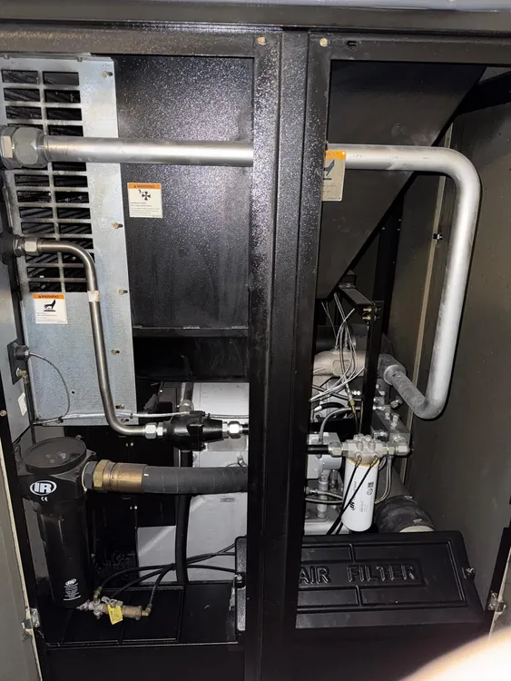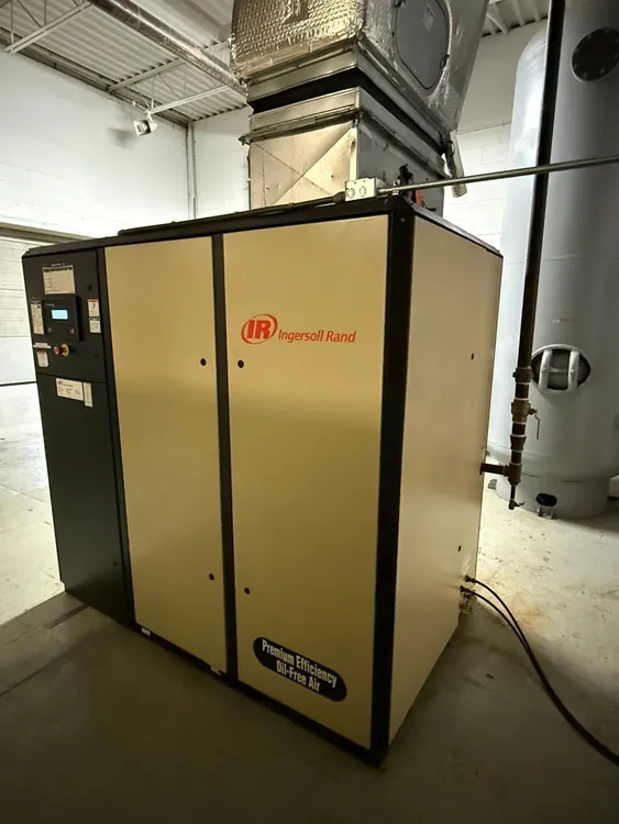 THE INGERSOLL RAND IRN75H-OF IS A 75 HP ROTARY SCREW AIR COMPRESSOR DESIGNED FOR INDUSTRIAL APPLICATIONS. THIS UNIT OPERATES ON A 460 V, 3-PHASE, 60 HZ POWER SUPPLY WITH A TOTAL PACKAGE AMPERAGE OF 99 A AND A MAXIMUM STARTING AMPERAGE OF 99 A. IT FEATURES A VARIABLE DRIVE MOTOR AND A 120 V CONTROL VOLTAGE SYSTEM. TECHNICAL SPECIFICATIONS INCLUDE A MAXIMUM DISCHARGE PRESSURE OF 150 PSIG, A 75 HP NOMINAL DRIVE MOTOR, AND A 5.0 HP NOMINAL FAN MOTOR. THE PACKAGE INCLUDES A TRANSFORMER AND A TANK, WITH THE DRIVE COOLING FAN UNIT HAVING BEEN REPLACED IN 2023. THE EQUIPMENT WEIGHS 5,000 LBS AND HAS PHYSICAL DIMENSIONS OF 82 X 52 X 77 INCHES.