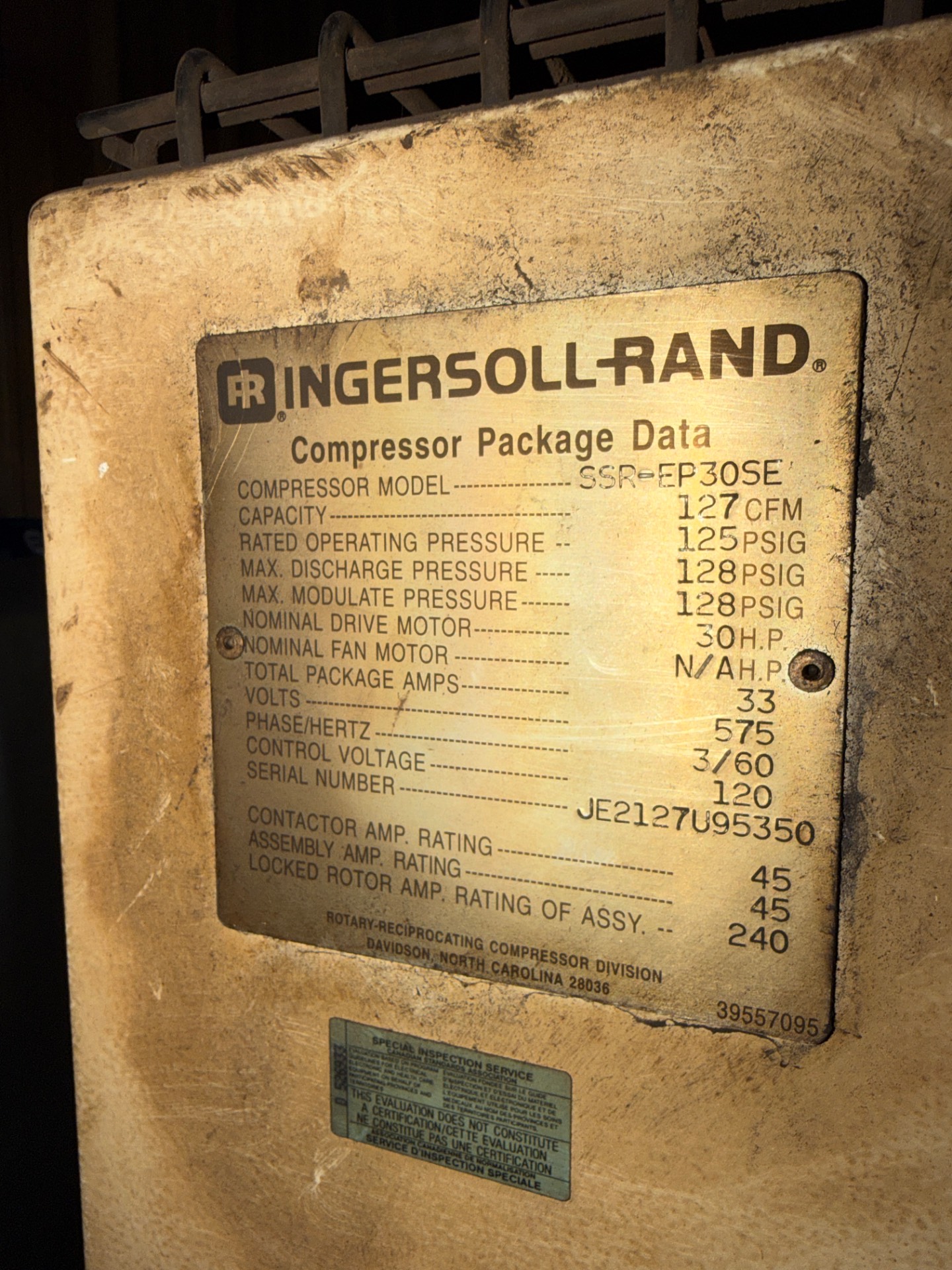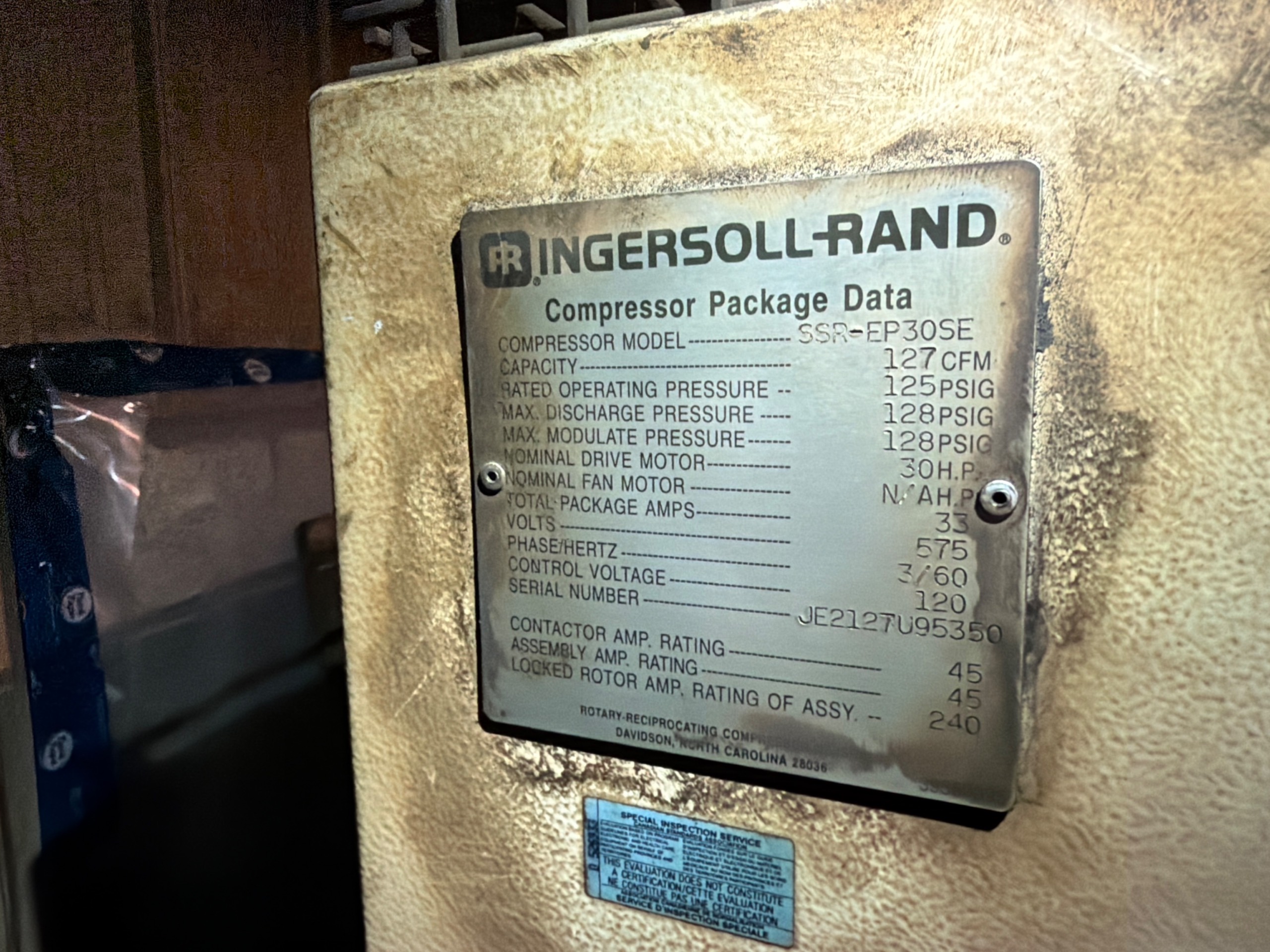 THE INGERSOLL RAND SSR-EP30SE IS A STATIONARY AIR COMPRESSOR DESIGNED FOR INDUSTRIAL APPLICATIONS. THE UNIT IS EQUIPPED WITH A 30 HP DRIVE MOTOR AND DELIVERS A RATED CAPACITY OF 127 CFM AT AN OPERATING PRESSURE OF 125 PSIG, WITH A MAXIMUM DISCHARGE AND MODULATE PRESSURE OF 128 PSIG.