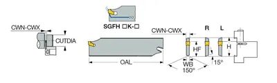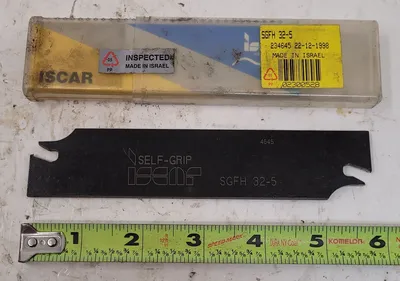 THE ISCAR SELF-GRIP SGFH 32-5 IS A PARTING AND GROOVING BLADE WITH A NEUTRAL CUTTING DIRECTION, SUITABLE FOR EXTERNAL GROOVING AND PARTING APPLICATIONS. THE BLADE HAS A SHANK HEIGHT OF 1.26″ AND AN OVERALL LENGTH OF 5.906″. THE BODY WIDTH IS 0.157″, AND THE TOOL ASSEMBLY LENGTH IS 1.202″. IT FEATURES TWO POCKETS AND IS DESIGNED FOR A MINIMUM CUTTING WIDTH OF 0.179″ AND A MAXIMUM CUTTING WIDTH OF 0.217″. THE MAXIMUM WORK PIECE PARTING DIAMETER SUPPORTED IS 4.724″.