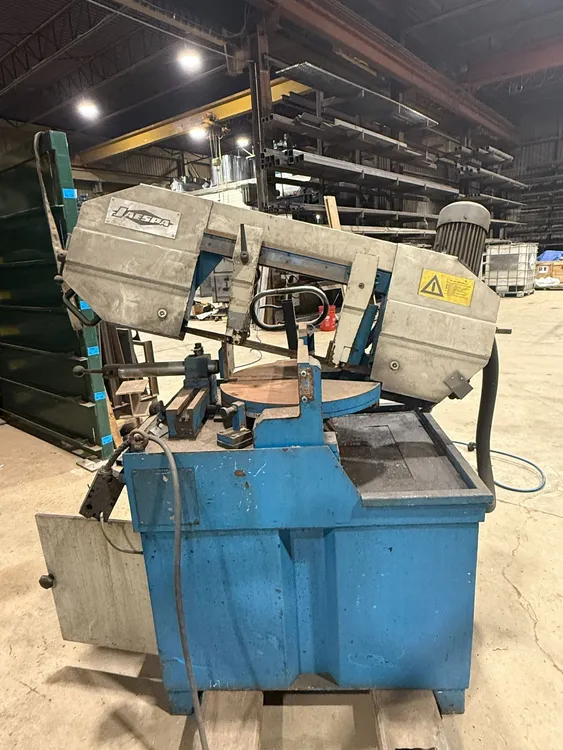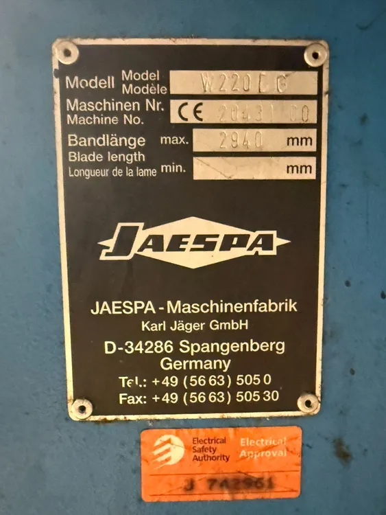 THE JAESPA W220DG MITER BAND SAW FEATURES A CUTTING CAPACITY AT 90° OF Ø 250 MM (ROUND) AND 220×220 MM (SQUARE). THE MACHINE OPERATES ON 600V / 60HZ / 3PH POWER AND IS EQUIPPED WITH A 1.5 KW MOTOR. IT OFFERS A SAWBAND SPEED RANGING FROM 17 TO 106 M/MIN (55 TO 405 F.P.M.). THE SAWBAND DIMENSIONS ARE 3660 X 27 X 0.9 MM (145 X 1.06 X 0.035 INCHES). THE BAND SAW ALSO INCLUDES A MATERIAL LENGTH STOP WITH A RANGE OF 0 TO 1000 MM (0 TO 39.5 INCHES).