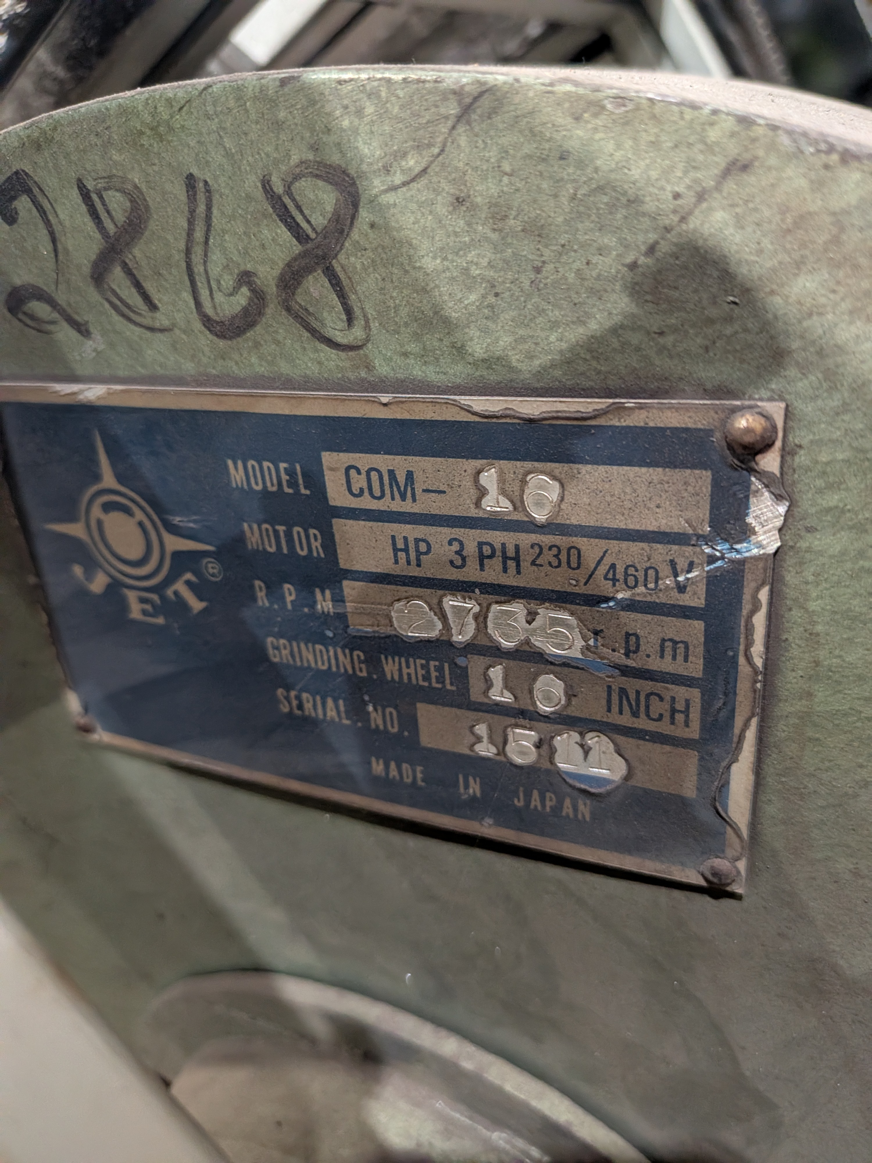 JET COM-16 GRINDING MACHINE, 3 HP LEESON MOTOR, 16IN WHEEL, 1740 RPM, 230/460V, 3-PHASE