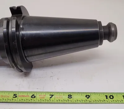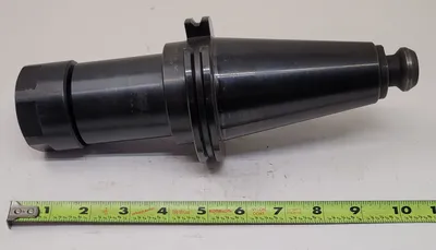 THIS KENNAMETAL COLLET CHUCK, PART NUMBER 5728-2322 C-J-11, FEATURES A CAT 50 HOLDER TYPE. THE OVERALL LENGTH OF THE ENTIRE PIECE IS 10-3/8 INCHES. IT HAS A PROJECTION OF 5-1/4 INCHES, A BODY DIAMETER OF 2-1/4 INCHES, AND A BORE DIAMETER OF 1 INCH.