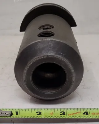 THIS KENNAMETAL CAT 50 END MILL HOLDER FEATURES A 1.5-INCH INNER DIAMETER AND A 3.125-INCH OUTER DIAMETER. THE HOLDER HAS A 6-INCH GAGE AND A 4.375-INCH PROJECTION. THE OVERALL LENGTH (OAL) IS 10 INCHES, EXTENDING TO 12 INCHES WITH THE BUTTON ATTACHED. A 3/8-INCH ALLEN WRENCH IS INCLUDED FOR THE SCREW CLAMPS ON THE END.