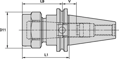 THE KENNAMETAL ERICKSON CV40TG100400 COLLET CHUCK IS A CAT 40 HOLDER FEATURING AN ISO CATALOG ID OF CV40TG100400 AND A CATALOG COLLET SERIES OF TG100. KEY DIMENSIONAL SPECIFICATIONS INCLUDE A LOCK NUT DIAMETER ([D11]) OF 61.976 MM, A GAGE LENGTH ([L1]) OF 101.6 MM, AND A CLAMPING LENGTH ([L9]) OF 75 MM. THE CHUCK HAS AN ADJUSTMENT RANGE ([V]) OF 39 MM AND A TORQUE CATALOG FOOT POUNDS RATING OF 150. THE STOP SCREW ID DRIVE SIZE IS 4 MM & 5/32, AND THE OVERALL LENGTH IS 6.687 INCHES.