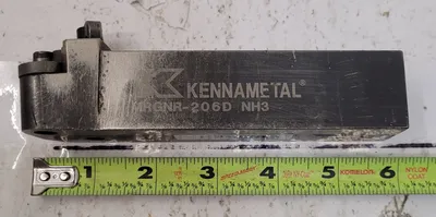 THE KENNAMETAL MRGNR-206D TOOLHOLDER FEATURES AN ANSI CATALOG ID OF MRGNR206D. ITS DIMENSIONS INCLUDE A SHANK HEIGHT OF 1.25 IN AND A SHANK WIDTH OF 1.25 IN. THE TOTAL TOOL LENGTH IS 6 IN, WITH A HEAD LENGTH OF 1.31 IN, AND AN F DIMENSION OF 1.5 IN. THIS TOOLHOLDER IS DESIGNED WITH A NEGATIVE RAKE. IT IS COMPATIBLE WITH A RN..64 GAGE INSERT. THE REQUIRED TOOL SIZES FOR ASSEMBLY ARE A LOCK PIN ID DRIVE SIZE OF 9/64 AND A CLAMP SCREW ID DRIVE SIZE OF 5/32.
