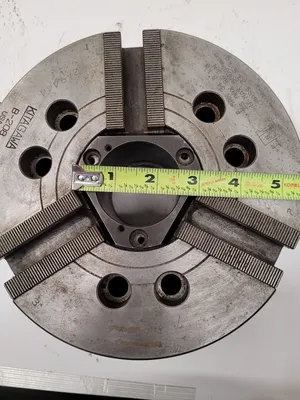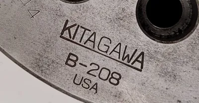 THE KITAGAWA B-208 IS A 3-JAW, 8.25-INCH OVERALL DIAMETER, OPEN CENTER POWER LATHE CHUCK. IT FEATURES A 52MM THROUGH-HOLE AND A MAXIMUM GRIPPING RANGE OF 210MM, WITH A MINIMUM RANGE OF 13MM. THE JAW STROKE (DIAMETER) IS 7.4MM, AND THE PLUNGER STROKE IS 16MM. THIS CHUCK IS RATED FOR A MAXIMUM SPEED OF 5000RPM AND HAS A MAXIMUM GRIPPING FORCE OF 86 KN (8769 KGF). THE MAXIMUM DRAW BAR PULL FORCE IS 34.8KN (3549 KGF). IT WEIGHS 22.3KG (WITH SOFT JAWS) AND HAS A MOMENT OF INERTIA OF 0.170 KG.M². THE MAXIMUM PRESSURE IS 2.65 MPA (27 CM²). MATCHING COMPONENTS INCLUDE THE S1552 CYLINDER, HB08A1 HARD TOP JAW, AND SB08B1 SOFT TOP JAW.
