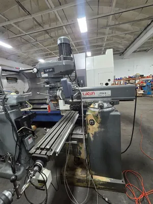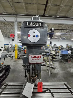 THE LAGUN/REPUBLIC FTV-2 VERTICAL MILL FEATURES A 3 HP MAIN MOTOR WITH MECHANICAL INFINITE VARIABLE SPEED SETTINGS, PROVIDING A RANGE OF 55 TO 4,250 RPM, SPLIT INTO LOW (55 TO 490 RPM) AND HIGH (490 TO 4,250 RPM). THE MILL IS EQUIPPED WITH A 55.25" X 10" (1,403 X 254 MM) T-SLOTTED TABLE WITH THREE 0.63" (16 MM) T-SLOTS ON 2.51" CENTERS, CAPABLE OF SUPPORTING A MAXIMUM WEIGHT OF 750 LBS. (340 KG). TRAVELS INCLUDE 37.99" (965 MM) FOR MANUAL X-AXIS TABLE TRAVEL, 15.98" (406 MM) FOR CROSS TRAVEL (Y-AXIS), AND 15.98" (406 MM) FOR KNEE TRAVEL (Z-AXIS). RAM TRAVEL IS 22.44" (570 MM). THE SPINDLE HAS AN R-8 TAPER AND A QUILL DIAMETER OF 3.38" (86 MM) WITH 5" (127 MM) OF TRAVEL. POWER QUILL FEEDS ARE AVAILABLE AT .0015, .00314, AND .00511 IN./REV (0.04; 0.08; 0.13MM/REV). HEAD SWIVEL IS +/- 90° (LEFT TO RIGHT) AND TILT IS +/- 45° (FRONT TO BACK). DISTANCE FROM SPINDLE TO COLUMN RANGES FROM 5" TO 26.96" (127 TO 685 MM), AND SPINDLE TO TABLE DISTANCE IS 0" TO 17.99" (0 TO 457 MM). THE MACHINE INCLUDES AN INTERNAL COOLANT SYSTEM AND ONE-SHOT LUBE.