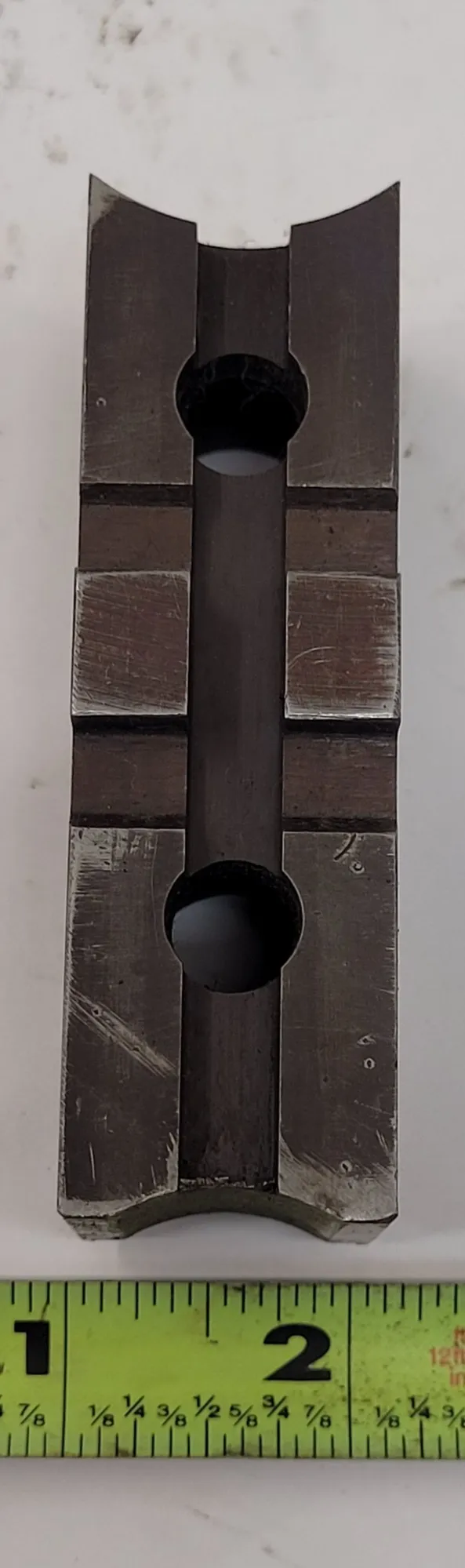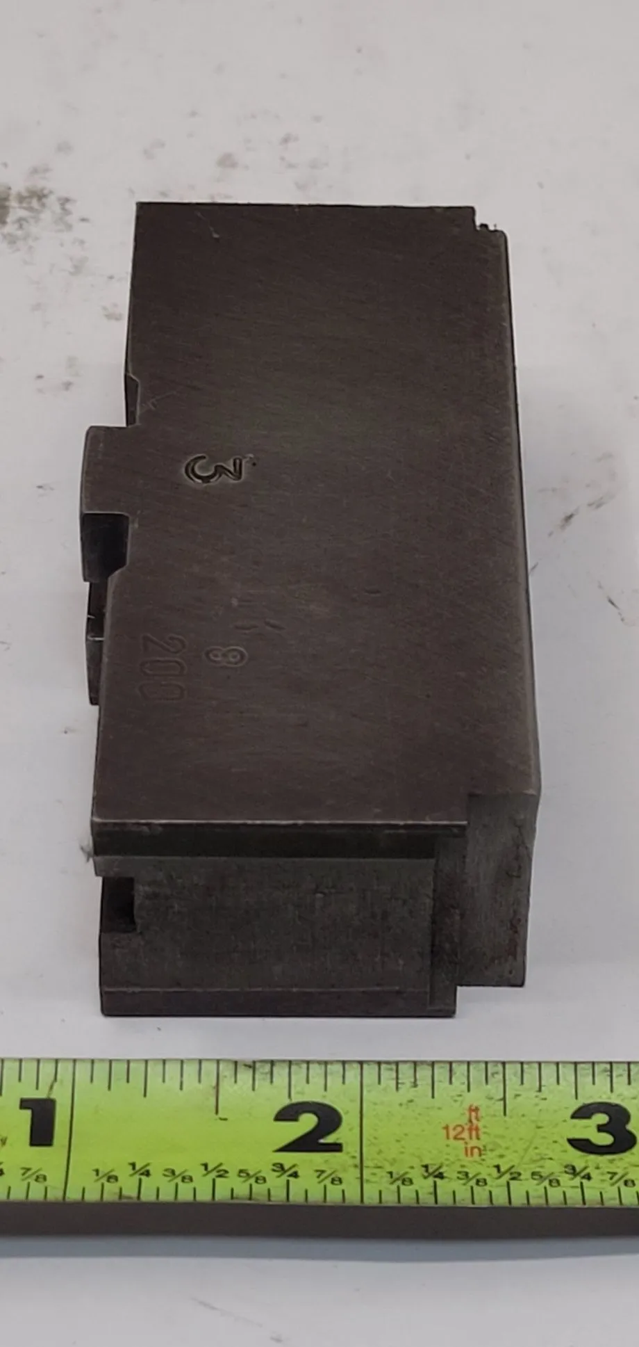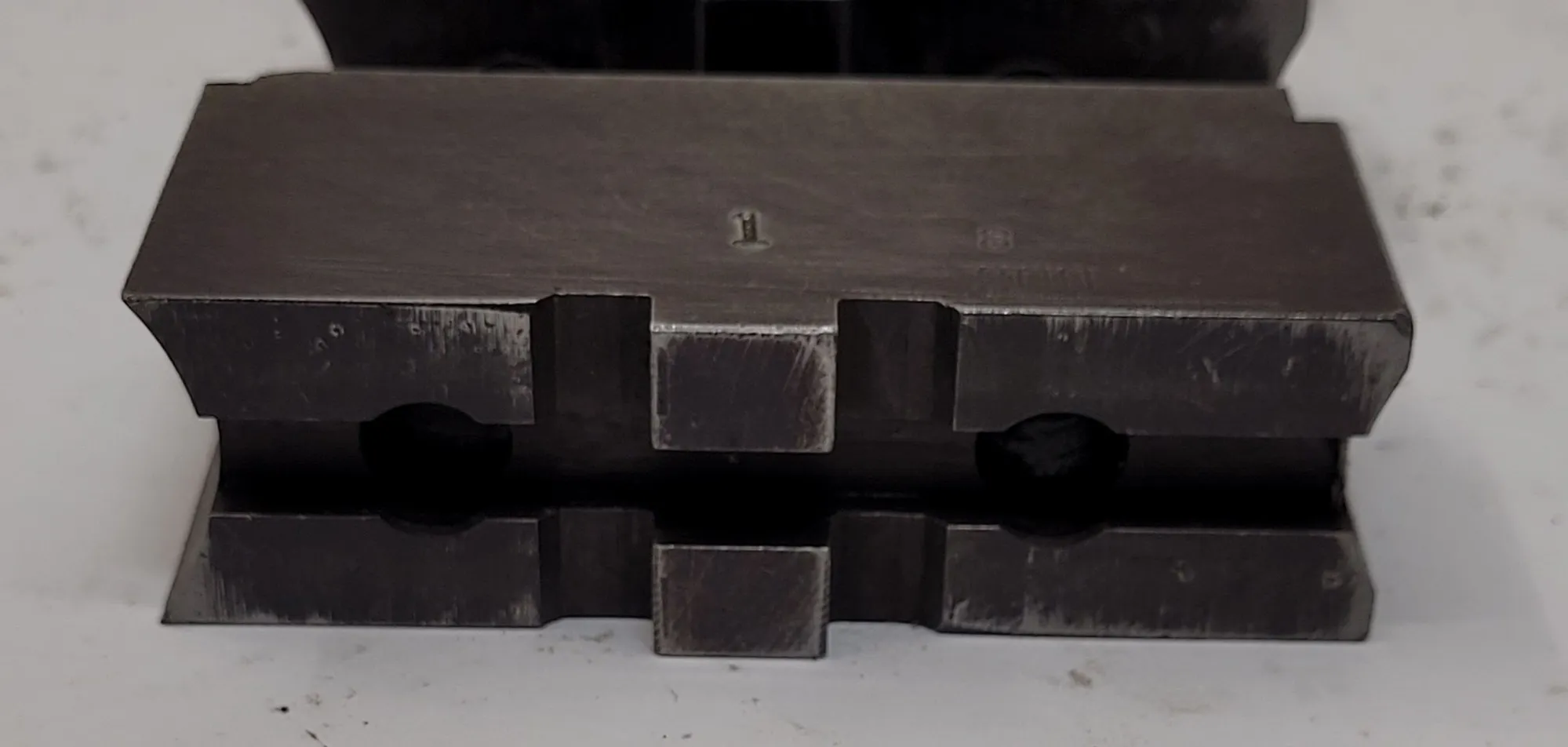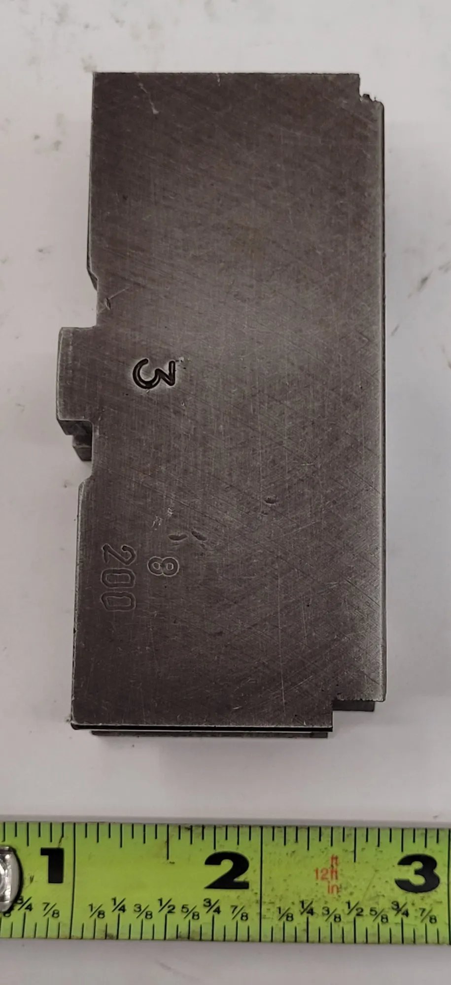 THIS SET OF THREE LATHE CHUCK JAWS FEATURES INDIVIDUAL JAW DIMENSIONS OF 3.5 X 1.5 X 1 INCHES. EACH COMPONENT IN THE SET IS STAMPED WITH NUMERICAL IDENTIFIERS 1, 2, AND 3 FOR SEQUENCE AND PLACEMENT.