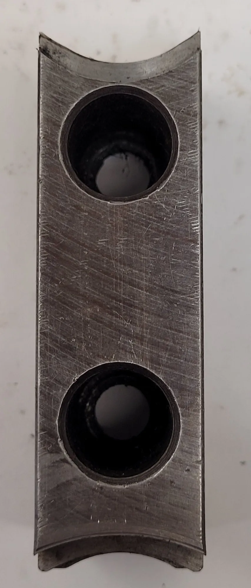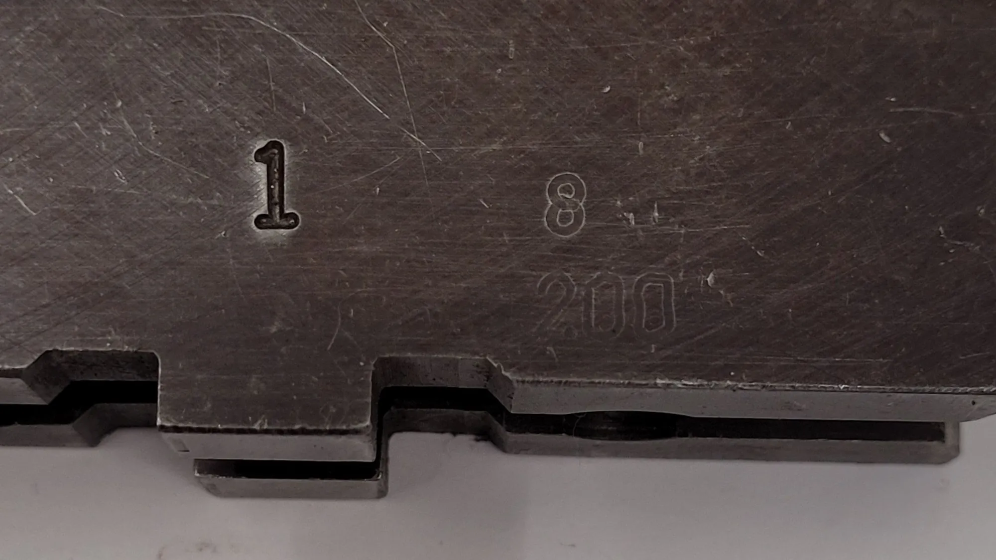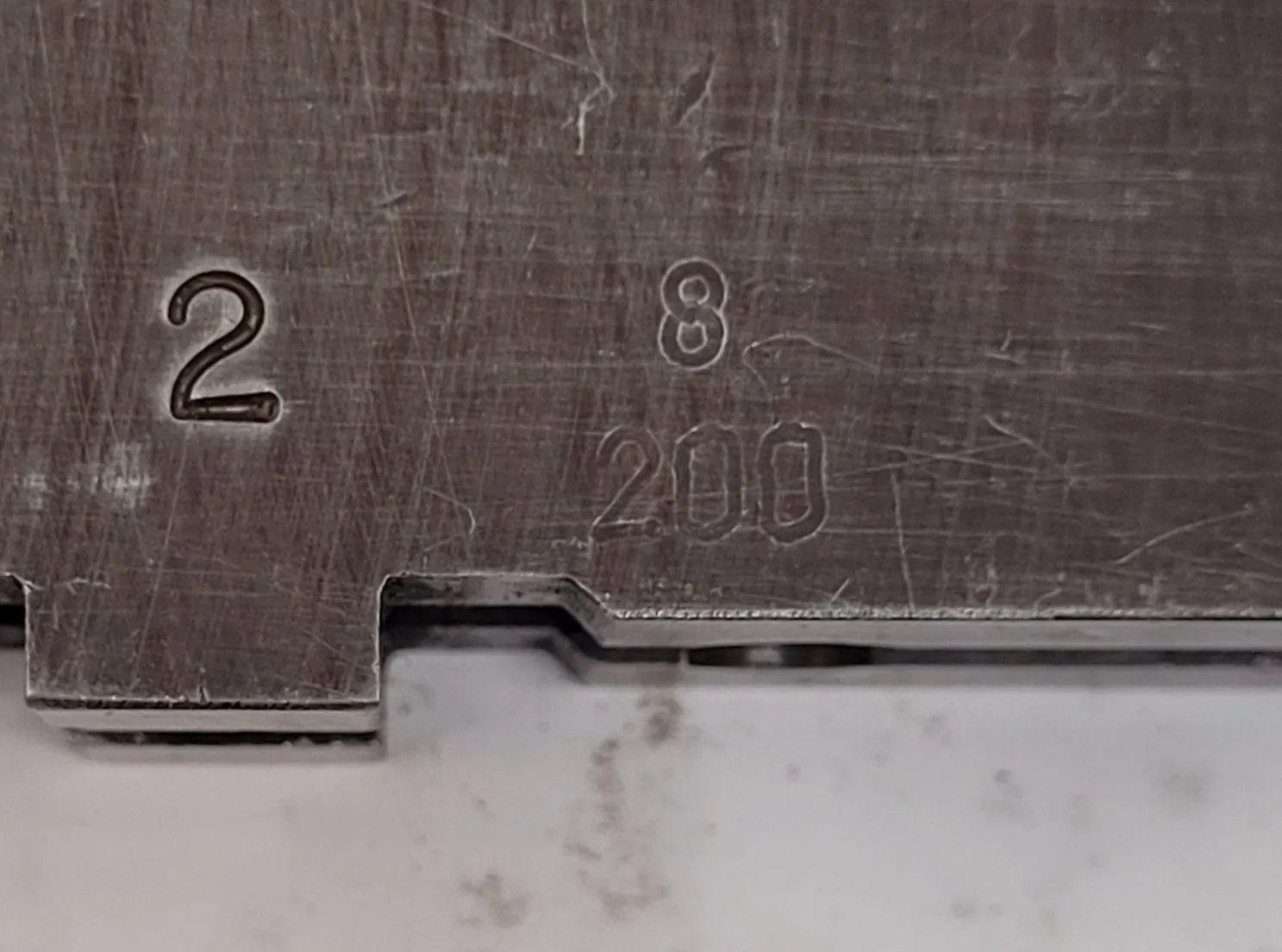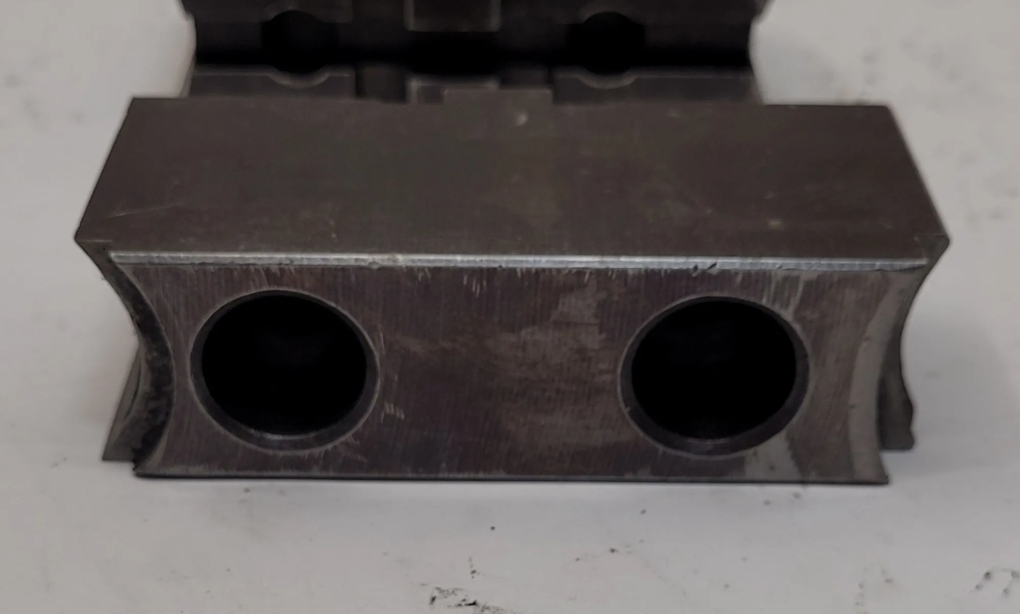 THIS SET OF THREE LATHE CHUCK JAWS FEATURES INDIVIDUAL JAW DIMENSIONS OF 3.5 X 1.5 X 1 INCHES. EACH COMPONENT IN THE SET IS STAMPED WITH NUMERICAL IDENTIFIERS 1, 2, AND 3 FOR SEQUENCE AND PLACEMENT.