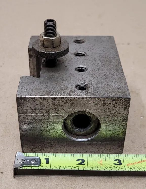 THIS QUICK-CHANGE BORING BAR TOOL POST HOLDER IS A VERSATILE ACCESSORY DESIGNED FOR LATHE OPERATIONS AND CATEGORIZED AS LATHE TOOLING. THE UNIT IS SPECIFICALLY ENGINEERED TO ACCOMMODATE A 1-INCH BORE DIAMETER. THE DIMENSIONS OF THE HOLDER ARE 2 INCHES IN OVERALL HEIGHT, 3 INCHES IN OVERALL LENGTH, AND 4 INCHES IN OVERALL WIDTH. IT FEATURES A 2-1/4 INCH WEDGE DIMENSION AND INCLUDES ADDITIONAL BUSHINGS DESIGNED FOR A 1/2-INCH DIAMETER BORE, ENABLING GREATER FLEXIBILITY IN TOOLING SETUP.