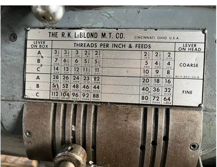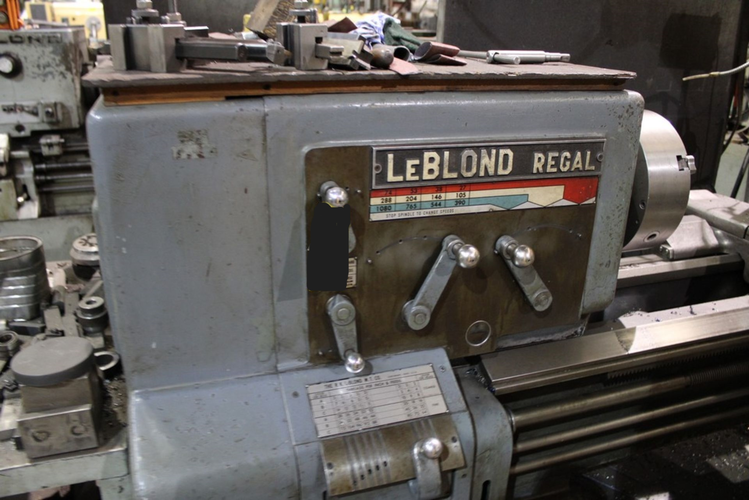 THE LEBLOND F21 REGAL ENGINE LATHE FEATURES AN ACTUAL SWING OVER THE BED WAYS OF 22.25 INCHES, A RATED SWING OF 21 INCHES, AND A 72-INCH DISTANCE BETWEEN CENTERS. THE SWING OVER THE CROSS SLIDE MEASURES 14.25 INCHES, WITH THE CROSS-SLIDE OFFERING 13.25 INCHES OF TRAVEL. THE SPINDLE BORE IS 2.1875 INCHES, DRIVEN BY A 10 HP MAIN MOTOR OPERATING AT 1735 RPM. THIS SETUP PROVIDES 12 SPINDLE SPEEDS RANGING FROM 27 TO 1080 RPM. THE MACHINE INCLUDES A QUICK CHANGE GEAR BOX TO ACHIEVE 56 CARRIAGE LONGITUDINAL FEEDS FROM 0.0036 TO 0.205 IPR AND 56 THREAD CHANGES RANGING FROM 2 TO 112 TPI. THE TAILSTOCK HAS A 3.125-INCH SPINDLE DIAMETER AND 7.5 INCHES OF TRAVEL. STANDARD EQUIPMENT LISTED INCLUDES DIGITAL READOUTS, A 12-INCH 3-JAW CHUCK, FLAME HARDENED BED WAYS, TWO STEADY RESTS, A THREADING DIAL, AND A FULL LENGTH COOLANT-CHIP PAN. THE ELECTRICAL SYSTEM IS SPECIFIED AS 220-440/3/60.
