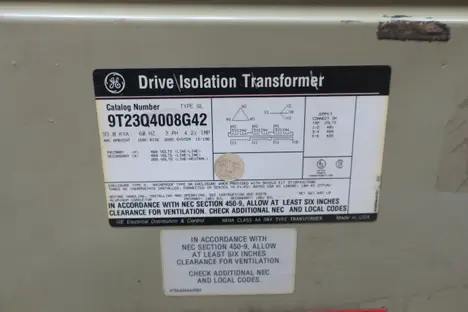 LOT OF 2 GENERAL ELECTRIC GE DRIVE ISOLATION VOLTAGE TRANSFORMER - MODEL 9T23Q4008G42, 3PH, 93KVA, 460V-AC, 266/460V-AC