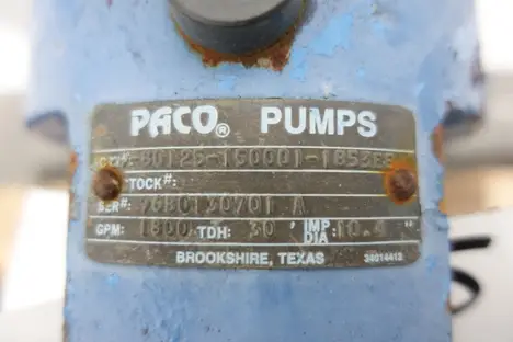LOT OF 2 PACO 29-80125-150001-1853EE CENTRIFUGAL PUMPS, 1800 GPM, IMP. DIA 10.4", TDH: 30'