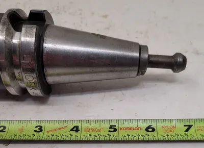 THE LYNDEX B4007-1000 IS A CAT 40 TOOL HOLDER WITH AN OVERALL LENGTH (OAL) OF 5.5IN WITHOUT THE BUTTON OR NUT ON THE HOLDER END. IT HAS A PROJECTION OF 2.84IN AND A BODY DIAMETER OF 2.19IN. THE BORE DIAMETER MEASURES 1.37IN, AND THE OUTER BORE DIAMETER IS 1.86IN.