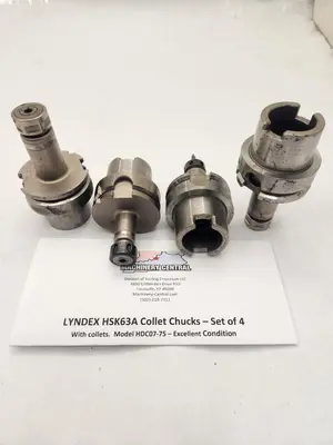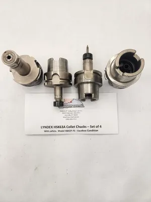 THIS ITEM IS A SET OF FOUR LYNDEX HSK63A COLLET CHUCKS. THESE CHUCKS FEATURE THE HSK63A SPINDLE INTERFACE. THE SET INCLUDES COLLETS AND IS IDENTIFIED BY THE MODEL HDC07-75.