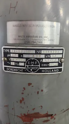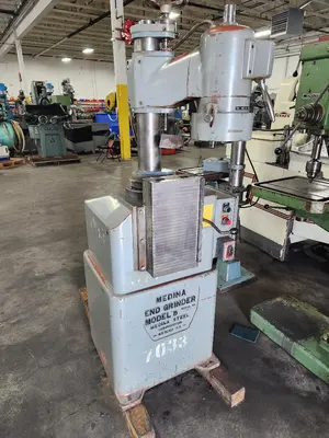 THE MEDINA MODEL B END GRINDER IS SPECIFIED WITH A GRINDING CAPACITY OF 46 INCHES IN LENGTH BY 20 INCHES IN WIDTH FOR DIE SECTIONS. THE HEIGHT FROM THE FLOOR TO THE FACE OF THE WHEEL IS 46 INCHES. IT FEATURES A 10 INCH BY 15 INCH CHUCK SIZE AND USES A GRINDING WHEEL MEASURING 7 INCHES BY 3 INCHES BY 1-1/4 INCH BORE. THE DOWNFEED GRADUATIONS OFFER PRECISE GRINDING CAPABILITY AT .001 INCHES. THE APPROXIMATE OVERALL DIMENSIONS ARE 22 INCHES BY 22 INCHES BY 68 INCHES, WITH AN APPROXIMATE WEIGHT OF 1,050 POUNDS.