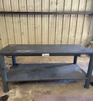METAL SHOP TABLE WITH RUBBER MAT. 6’L X 3’ W X 39” T. HAS 120-VOLT POWER RECEPTACLES