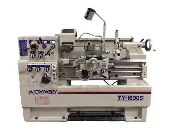 THE MICROWEILY TY-1630S IS A TOOLROOM ENGINE LATHE FEATURING A 16 INCH SWING OVER THE BED, A 9 7/16 INCH SWING OVER THE CROSS SLIDE, AND 30 INCHES BETWEEN CENTERS. THE SPINDLE IS POWERED BY A 5 HP MOTOR AND FEATURES A D1-6 NOSE WITH A 2 INCH BORE. IT OFFERS 12 SPINDLE SPEEDS RANGING FROM 30 TO 2,000 RPM. THREADING CAPABILITIES INCLUDE 40 IMPERIAL THREADS FROM 2-56 T.P.I., 53 METRIC THREADS FROM 0.4-14 MM PITCH, 32 DIAMETRAL PITCH THREADS FROM 4-32 D.P., AND 44 MODULE PITCH THREADS FROM 0.4-7 M.P. THE TAILSTOCK QUILL FEATURES A NO. 4 MORSE TAPER. STANDARD EQUIPMENT INCLUDES A HEIDENHAIN 2-AXIS DIGITAL READOUT (DRO), 10 INCH 3-JAW CHUCK, 12 INCH 4-JAW CHUCK, ALORIS QUICK CHANGE TOOL POST, STEADY REST, AND INCH/METRIC THREADING CAPABILITIES. THE UNIT HAS PHYSICAL DIMENSIONS OF 79 INCHES BY 40 INCHES BY 56 INCHES AND WEIGHS APPROXIMATELY 4,000 LBS.